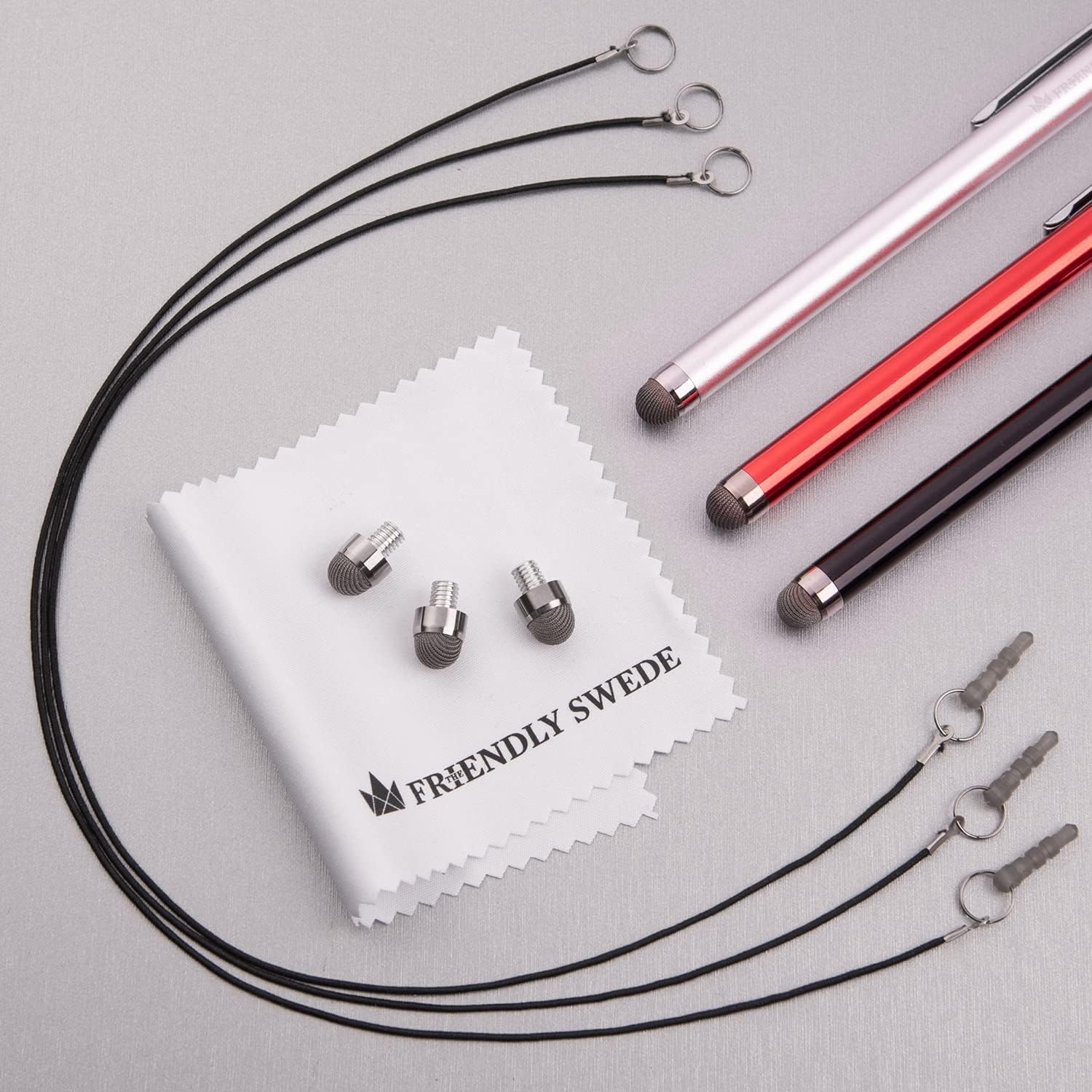 The Friendly Swede Stylus Pen for Touchscreen — 3-Pack 5.5" High Precision Stylus Pen with Replaceable Thin Tips, Elastic Lanyards & Screen Cleaning Cloth - Red/Black/Silver