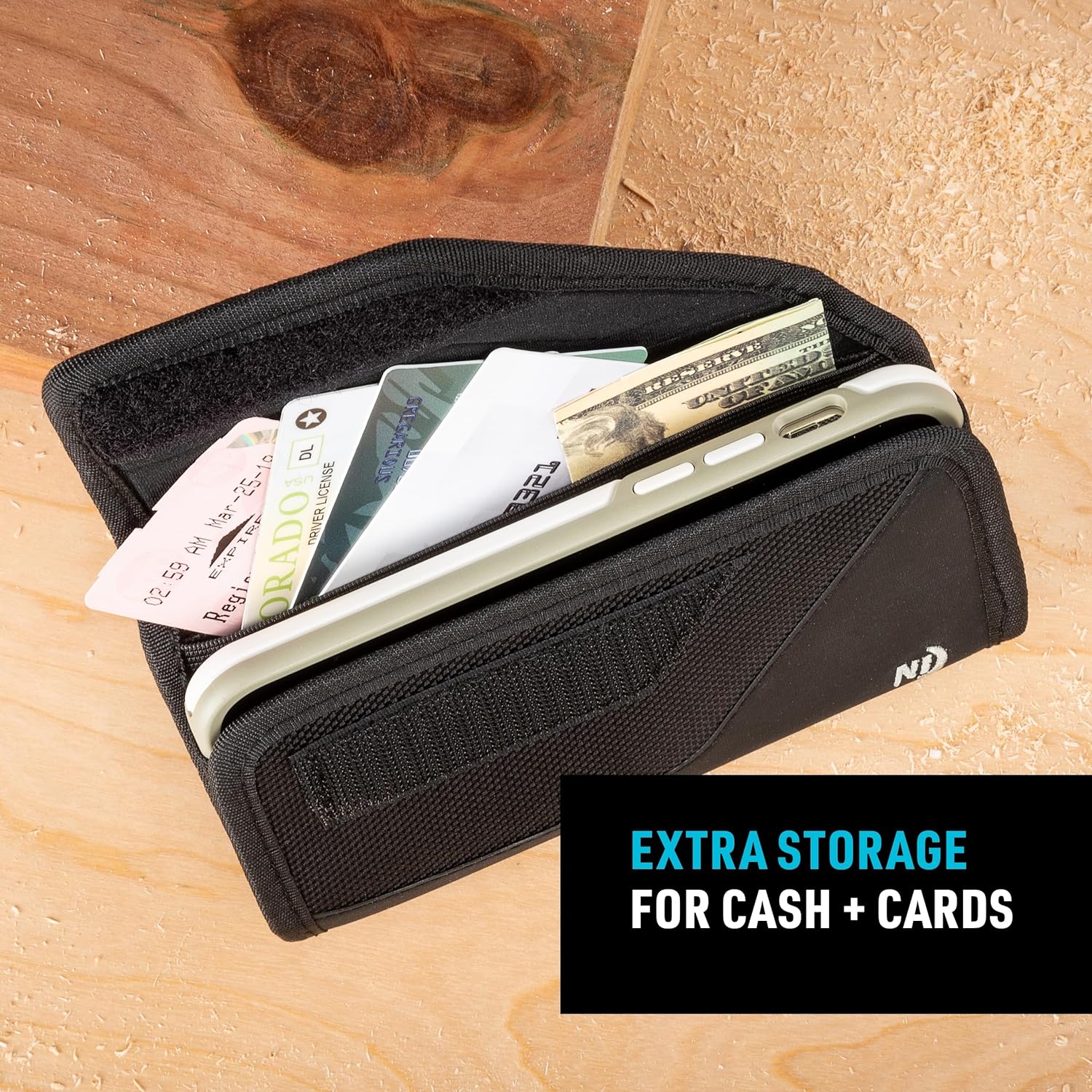- Phone Accessory with Extra Storage: This cell phone holder has extra storage for cash, credit cards, and IDs; this phone belt pouch has stretch panels for a versatile fit