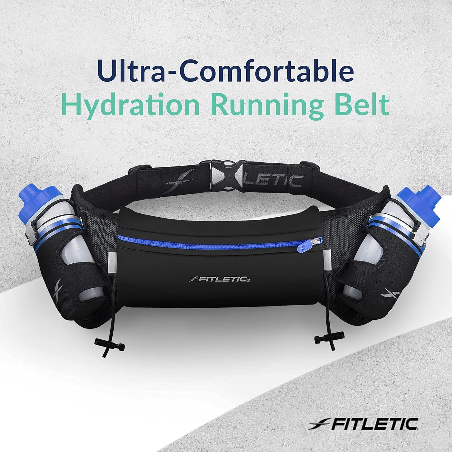 Fitletic Hydration Running Belt with Water Bottles for Men & Women – 2 Quick Flow 8oz Running Water Bottles, Patented Bounce Free Design, Water Resistant Pouch Fits All Phones – Hydra 16
