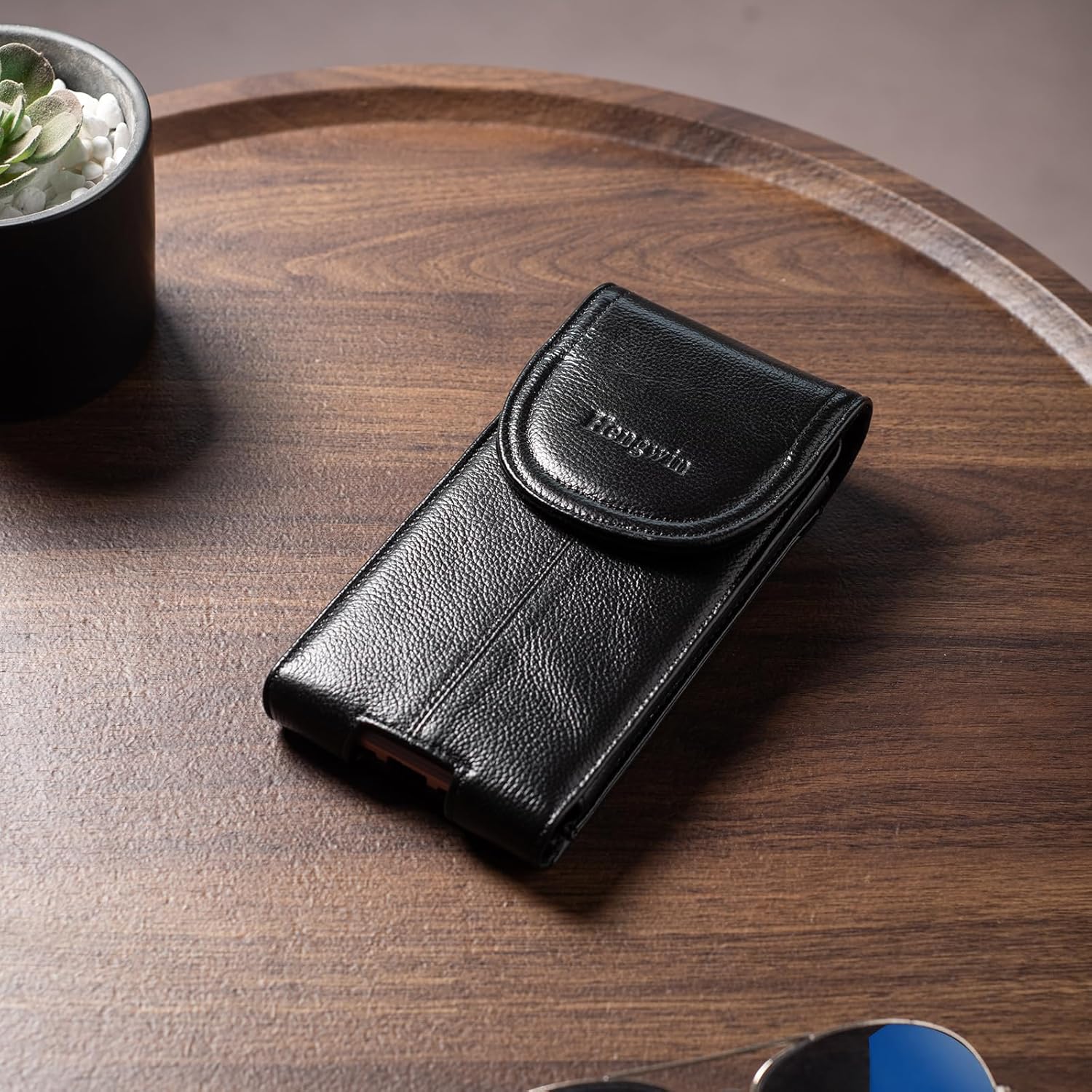 - Structure: This phone holder is constructed with 1 spacious compartment designed with a hole at the bottom to push the device out and a strong magnetic closure on the flap for safe storage and to access the items quickly