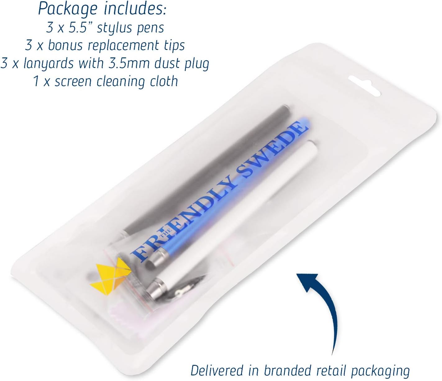 - VALUE-PACK: Bundle includes 3 x 5.5” Stylus pens, 3 x Replacement tips, 3 x 15" detachable elastic lanyards, microfiber screen cleaning cloth. Our styli do NOT use batteries or bluetooth connection.