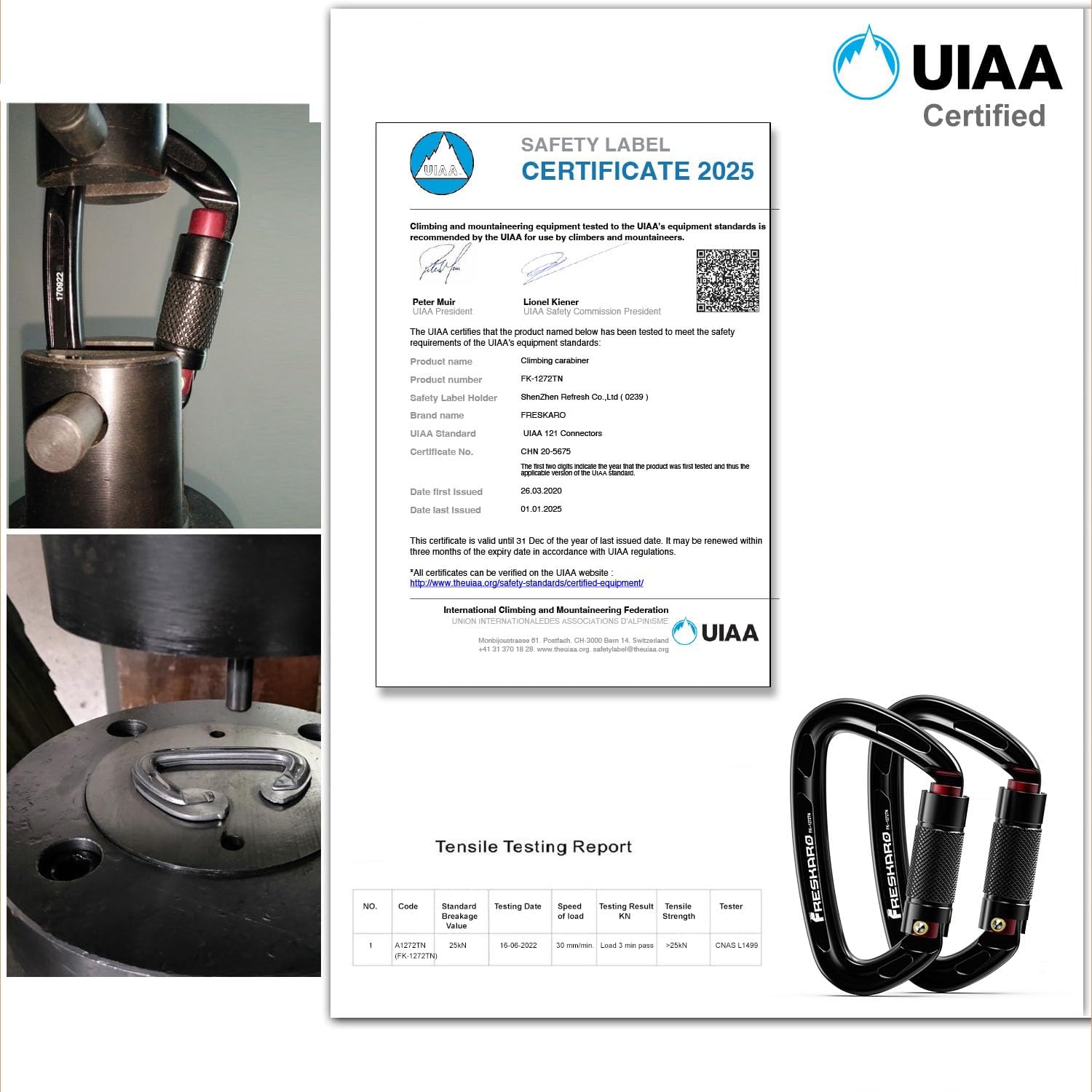 - 【STRONG CARABINER】- UIAA Certified in 2020, Major axis strength 25KN (5621lbs), Cross-loaded at 6KN, Made from Aircraft Grade Aluminium super lightweight and strong Tensile Strength. Strength is tested by Gotech Testing Machine, safety to use.