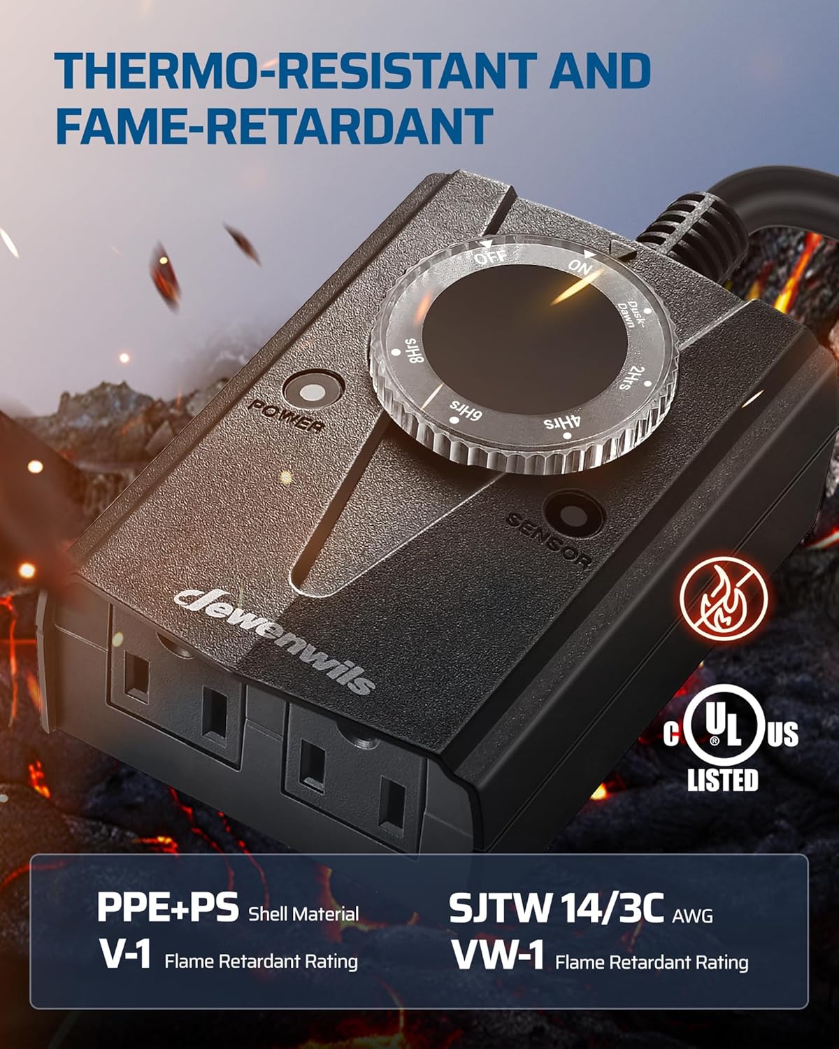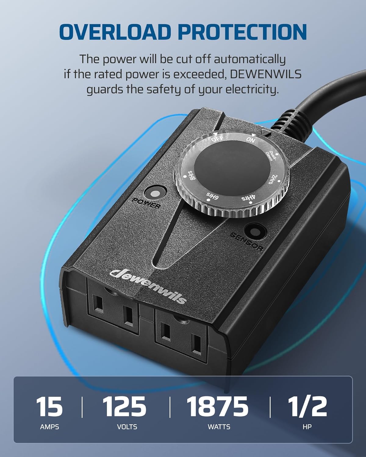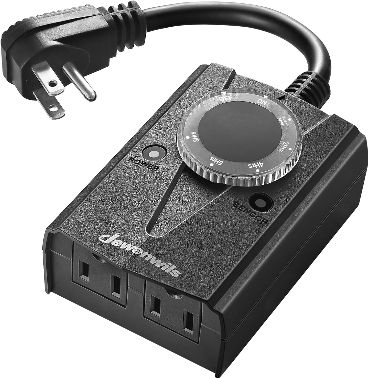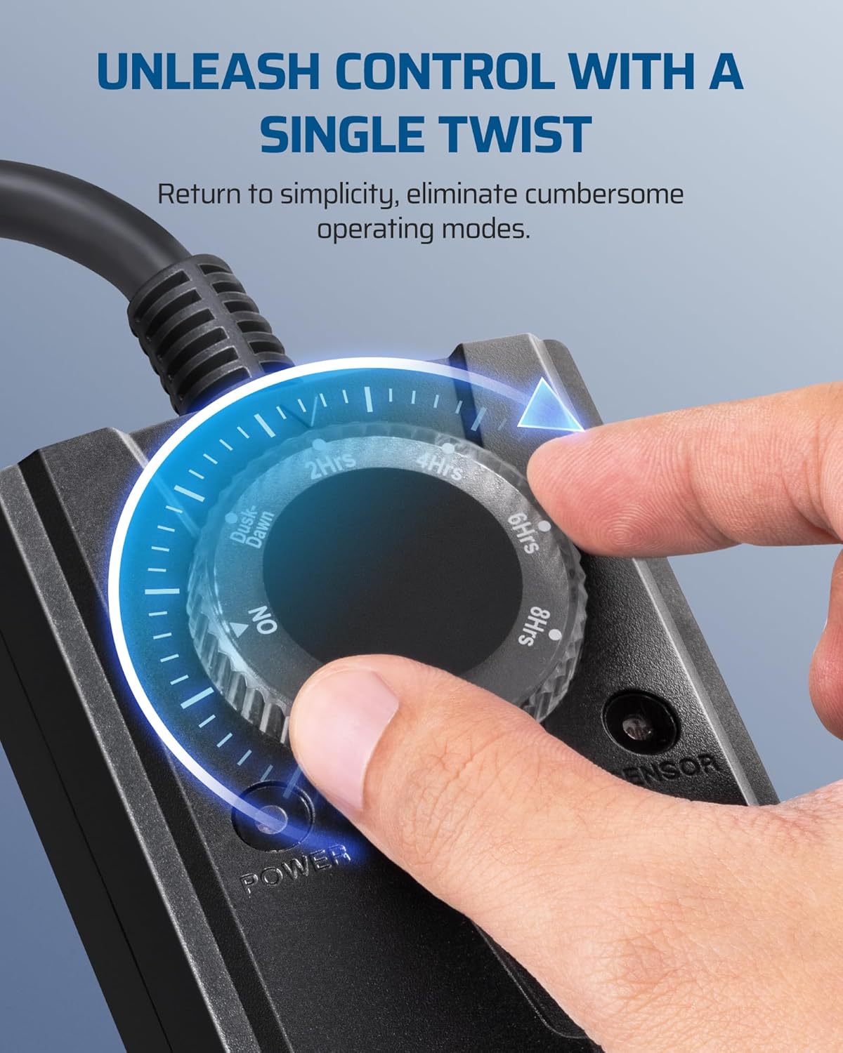 - MULTI TIMER CHOICES - Built-in light sensor mechanical timer, automatic or manually set lighting schedules with environment brightness; can turn on or off according daylight, or remain ON/OFF continuously; ON at dusk, OFF at dawn, ON at dusk OFF after 2/4/6/ 8 hours, daily repeat