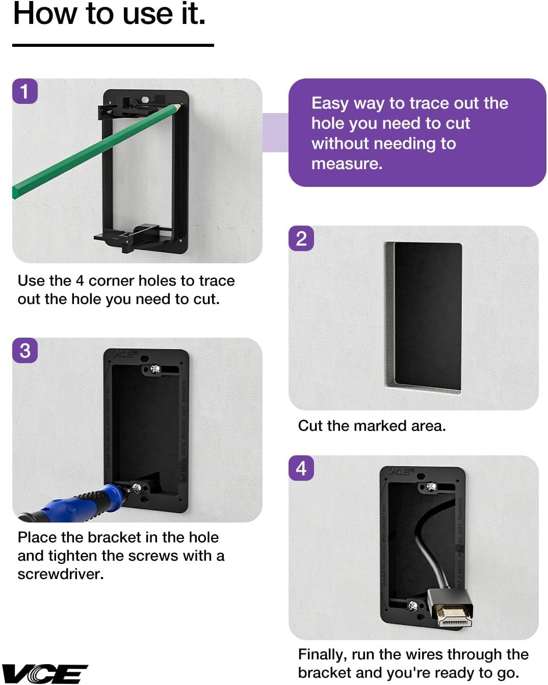 - EFFORTLESS INSTALLATION: This low voltage box is extremely easy to install, simply cut holes in the wall according to the 4 corner hole markings, then insert the bracket and tighten the two clamping wings to complete the installation. The bracket supports horizontal or vertical mounting, easy to operate, even if you don't have professional knowledge.