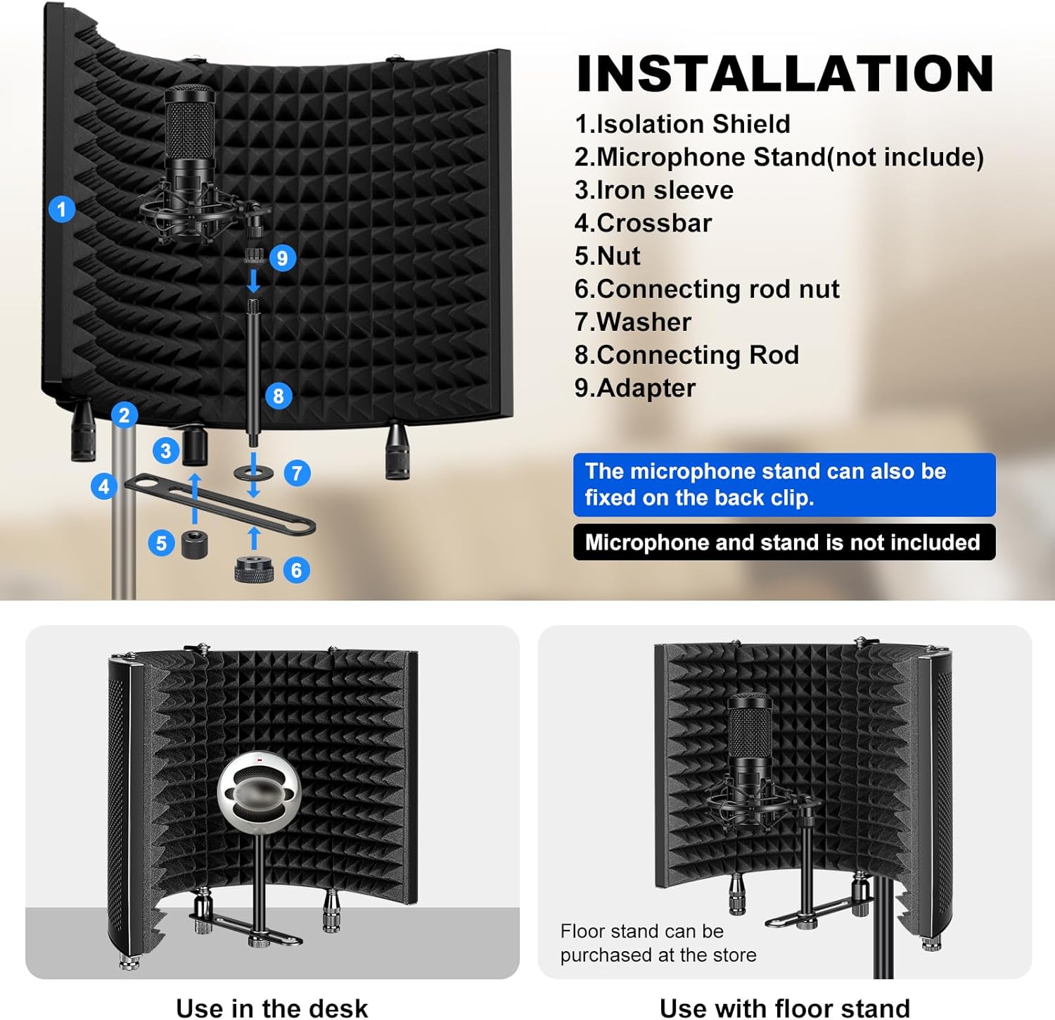 - ♪【Flexiblity & Convenience】♪: The folding panel design features enables angle adjustments, giving you optimal insolation. Compact design, lightweight construction as well as fold-ability allows you to carry it easily and take along wherever you go.* Note: This package contains a mic isolation shield and an adapter accessory package. It does not include headphones and microphone.