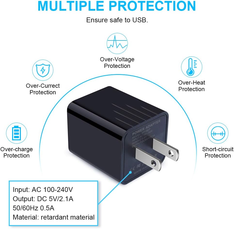 - 【2.1A Safety Dual Port USB Wall Charger】: This Home Travel Plug is lightweight, compact and easily portable. The USB Power Charging block Cube provide multiple protections, including: Short Circuit Prevention + Over-heat Protection + Over-current Protection + Over-voltage Protection + Over-charging Protection which can maximumly protect your device.