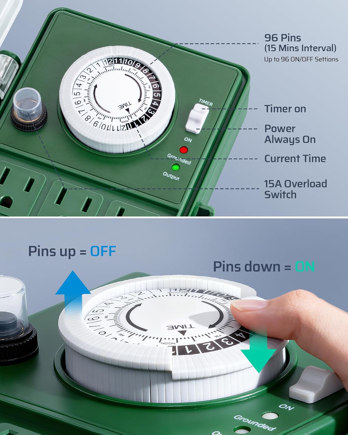 - [Easy to Program & Install] Simply rotate the dial clockwise to set the current time, switch to “TIMER” mode, and plug into a wall outlet; push out pins for your preferred schedule, then connect stakes and cords, insert into the ground, and it’s ready to use