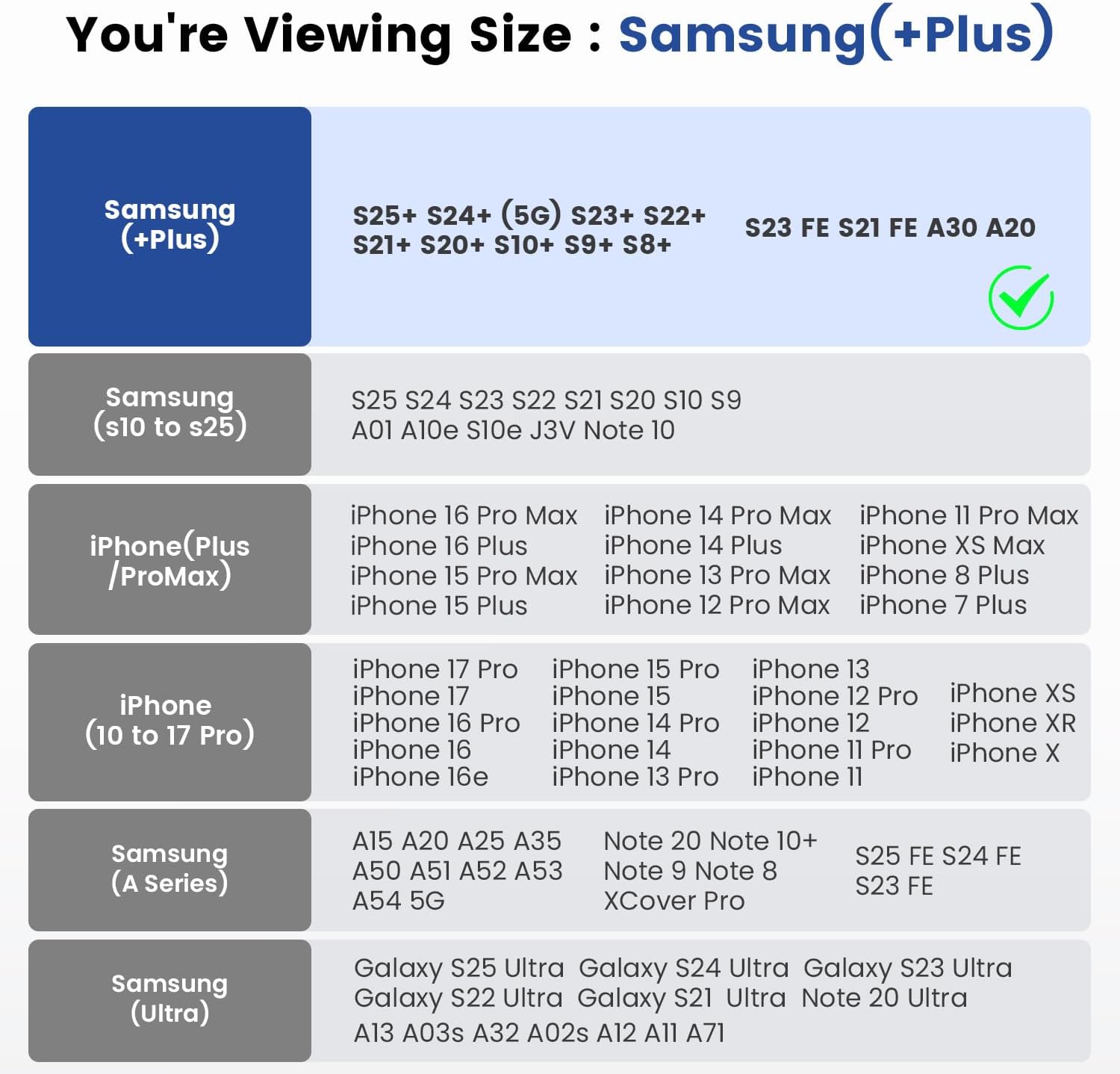 - Compatible Phone Models : Samsung Galaxy S25+, S24+ Plus 5G, S23+, S22+, S21+, S20+ S10+ S8+ S9+, S23 FE, S21 FE, A20, A30