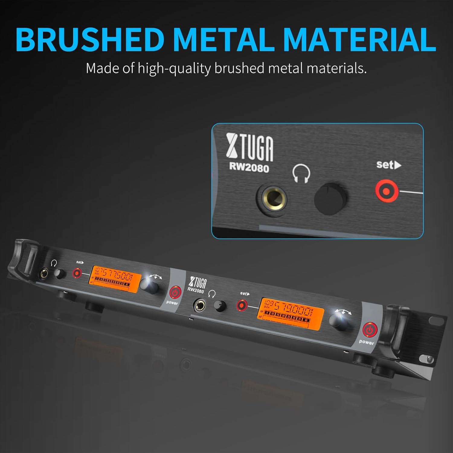- UHF IN-EAR MONITOR: XTUGA 2 channel wireless in ear monitor system utilizes UHF band circuitry. Delay-free operation compared to the 2.4GHz design. Advanced circuit design, clear the receiving blind angle to make the system's receiving signal steady, avoid interference.