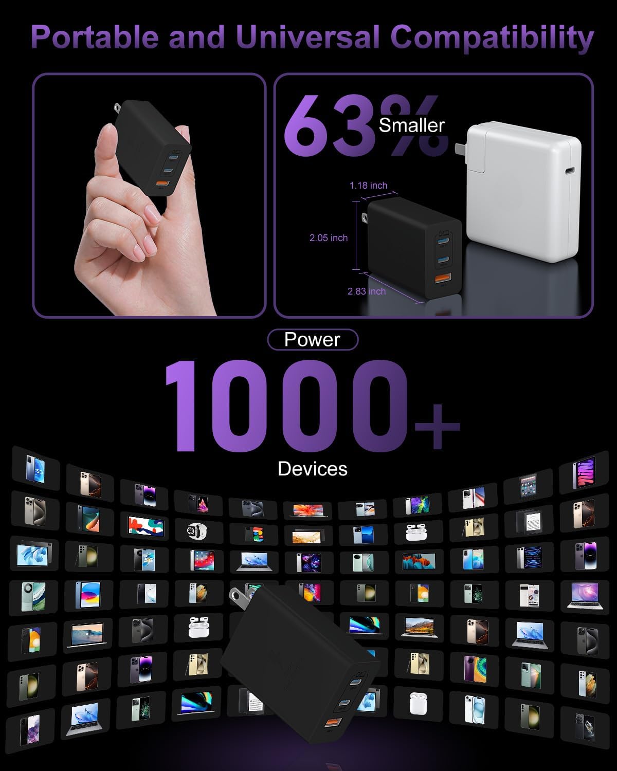- Universal Compatibility: This 100W GaN charger supports charging 1 laptop and 2 smartphones/tablets at the same time. Compatible with MacBook Pro/Air,iPhone 16/16 pro/15/15 pro/14/13, iPad Pro/Air/mini, Galaxy S24/23 Ultra, Google Pixel, Dell XPS, Switch, and more