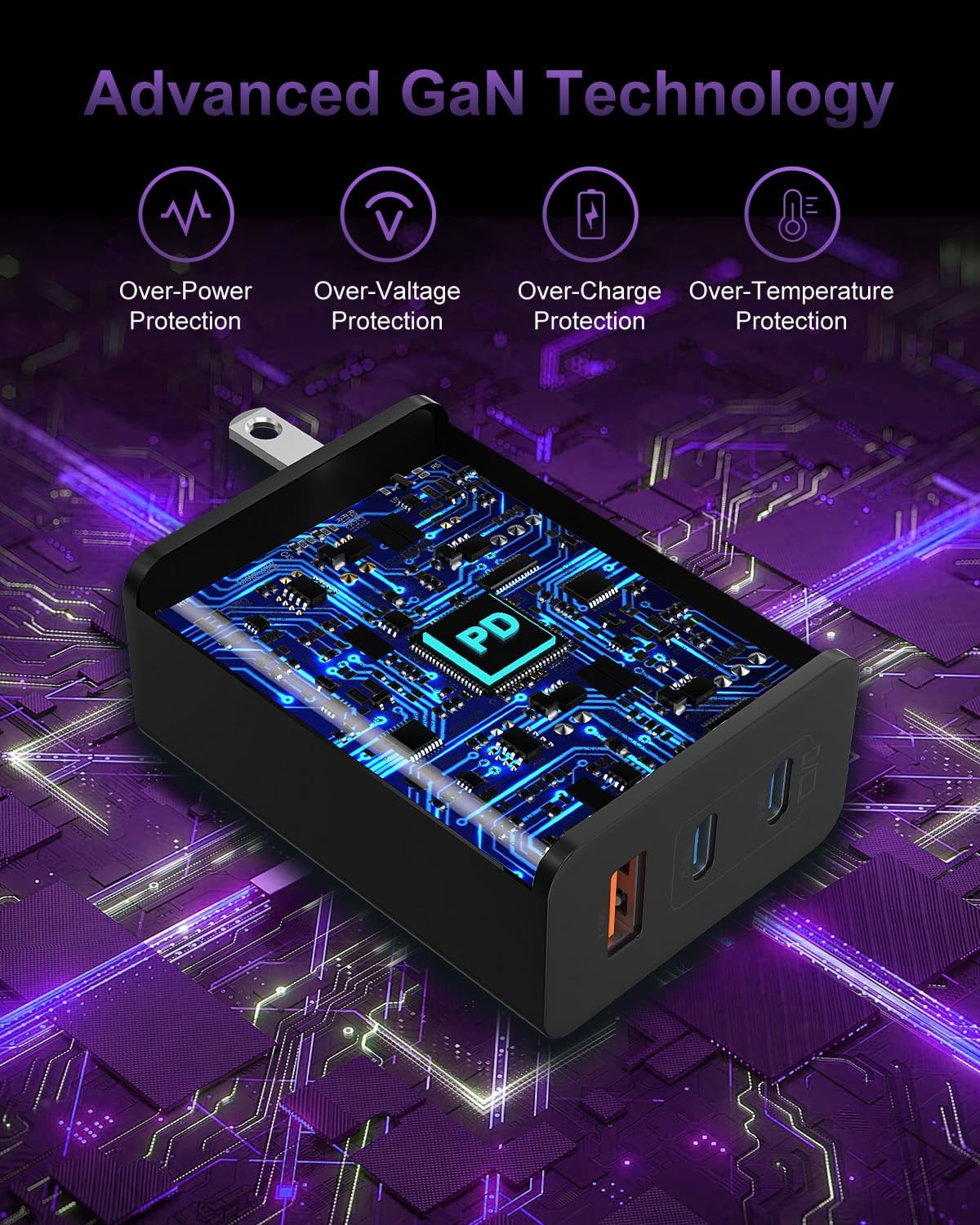 - Latest GAN III Chip Technology: Built-in GAN III chip technology and safety system, the type c charging block protects your devices from overheating, ensure security for you and your devices. Up to 95% charging efficiency and 68% smaller size, easily replacing traditional bulky and inefficient power adapters,the great partner of your travel