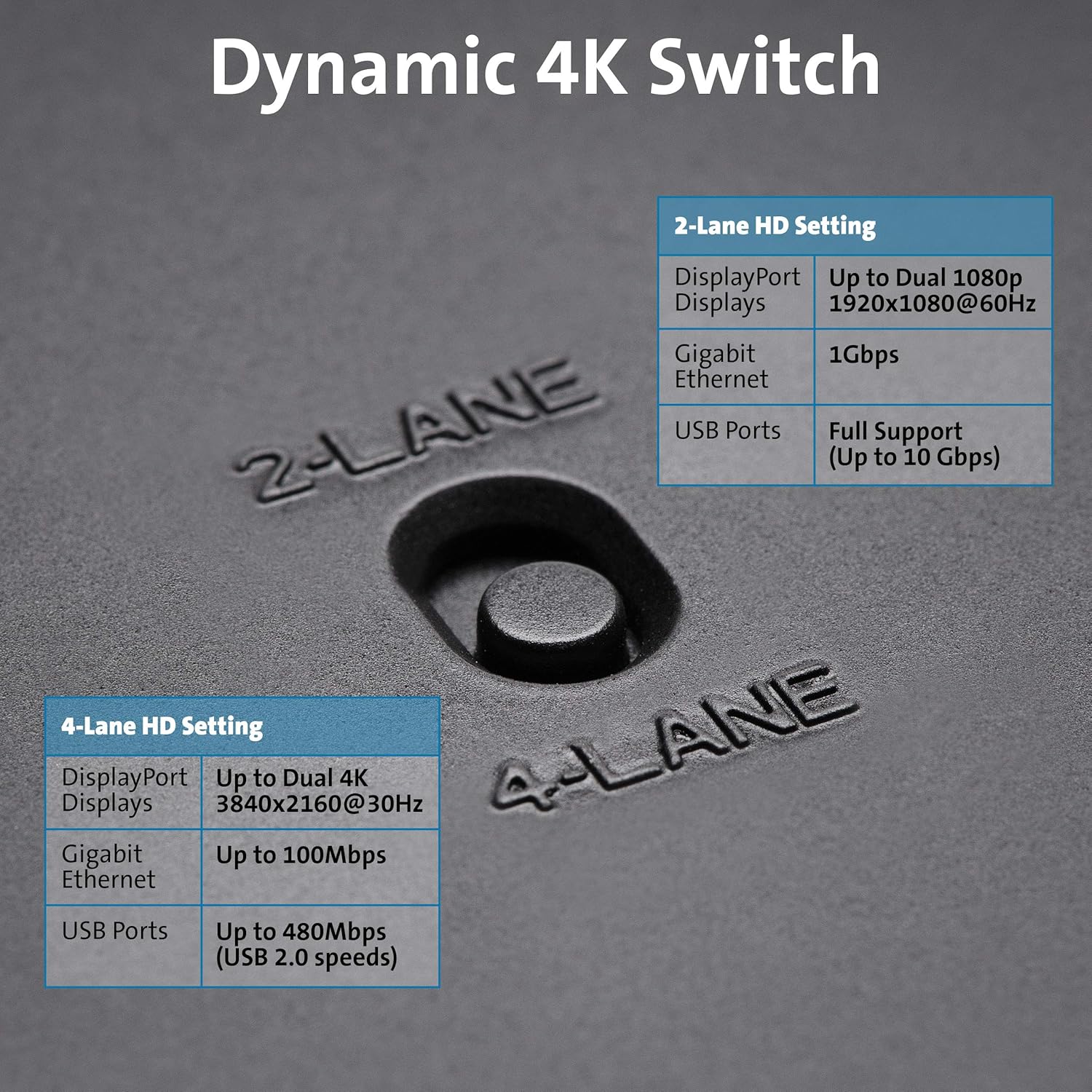 - For a dual monitor setup, a simple switch lets you have control over where the dock prioritizes speed: In 2 Lane mode you get dual monitor 1080p@60Hz, USB speeds of up to 10Gbps, and 1Gbps wired ethernet; in 4 Lane mode you get dual monitor 4k@30Hz, 480Mbps USB speeds and 100Mbps wired ethernet