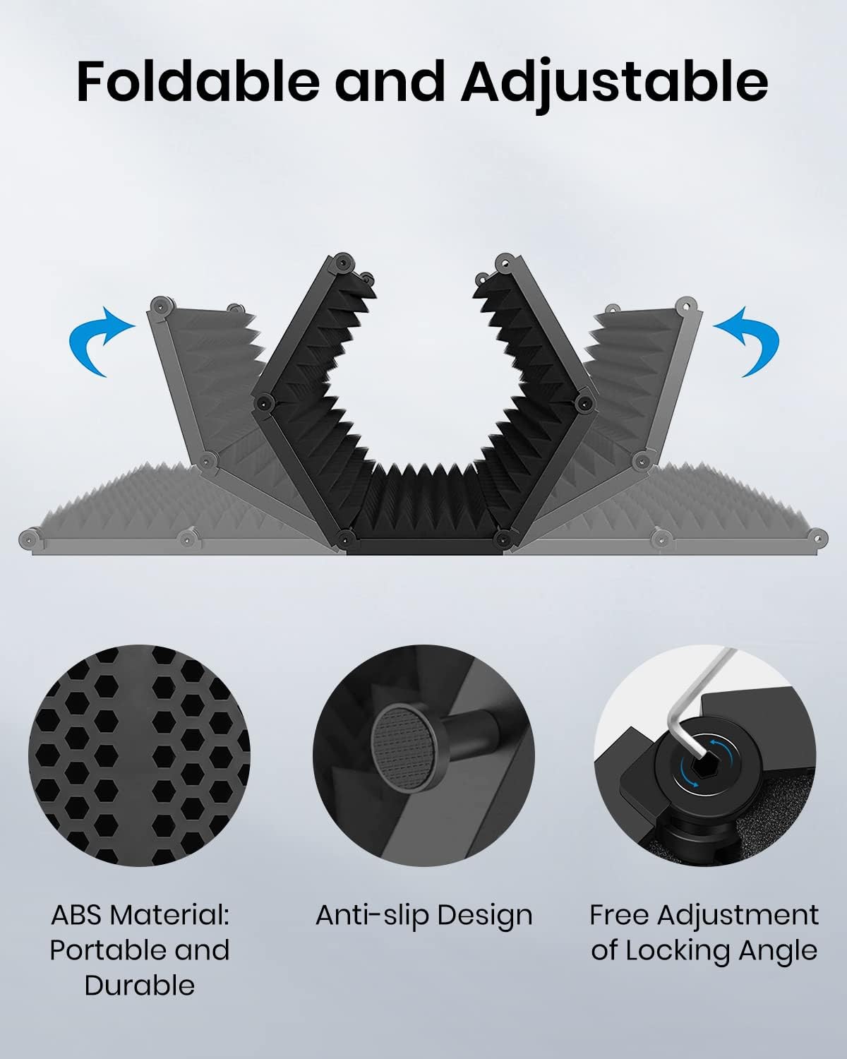 - 【Foldable & Adjustable】 Our vocal isolation shield is composed of 5 panels, and the foldable design allows you to be very flexible whether you are storing or carrying it out. It is easy to adjust the arch design, enables angle adjustments for optimal sound insulation ensures the highest quality recordings.