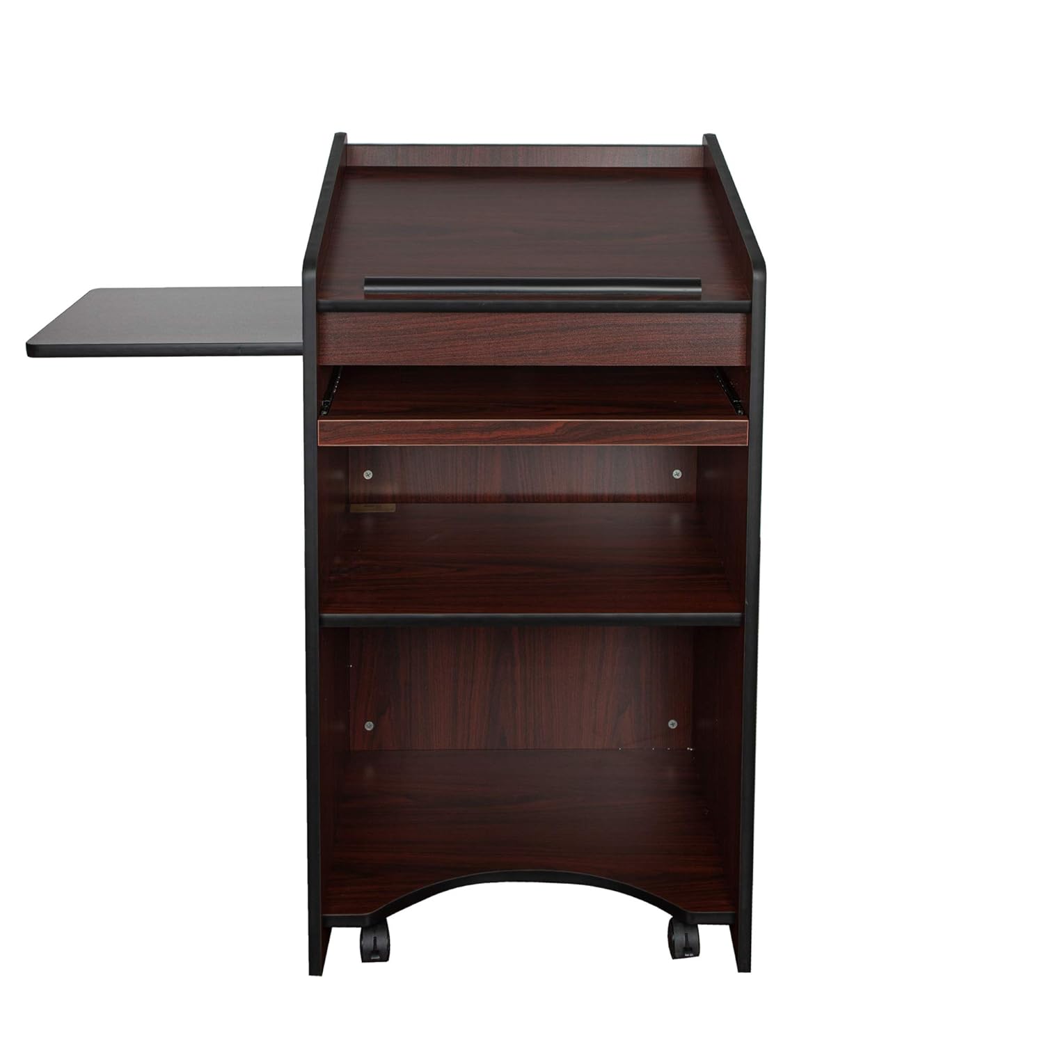 OEF Furnishings Mobile Floor Lectern with Side Shelf And Keyboard Tray, Mahogany
