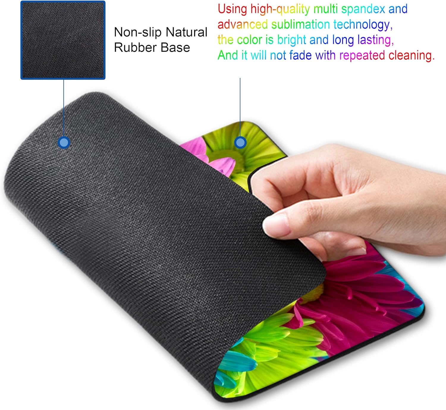 - 【Washable Design and Fade Prevent】 This mouse mat is made of multi spandex which has great locking-color effect. Liquid stains can be cleaned with water for continuous use. And it will not fade with repeated cleaning.