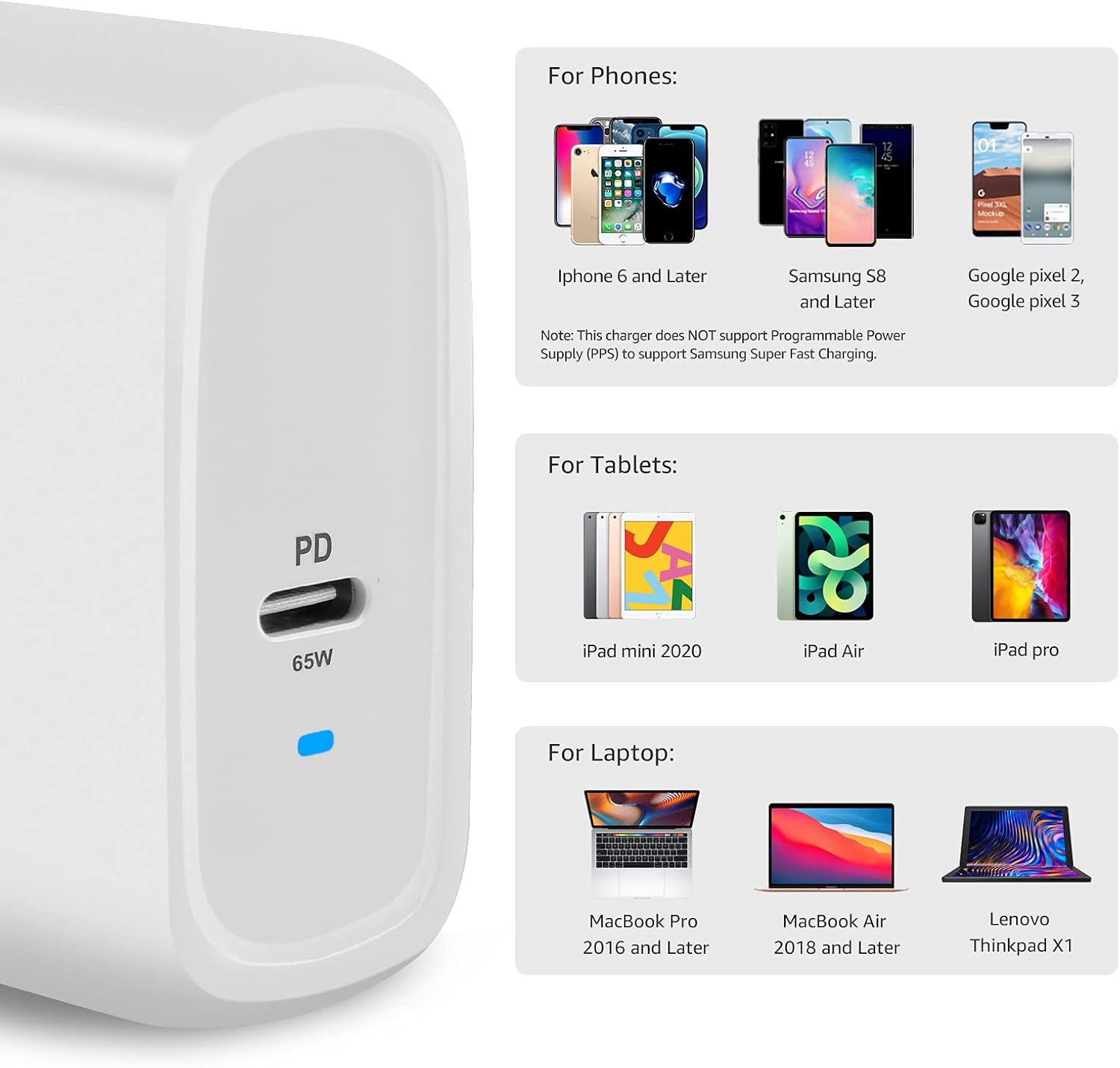 - Fast charging: 65-watt USB Power Delivery PD 3.0 for high-speed charging of compatible devices, like iPhone, iPad Pro, Samsung Galaxy, MacBook Air, MacBook Pro, and more