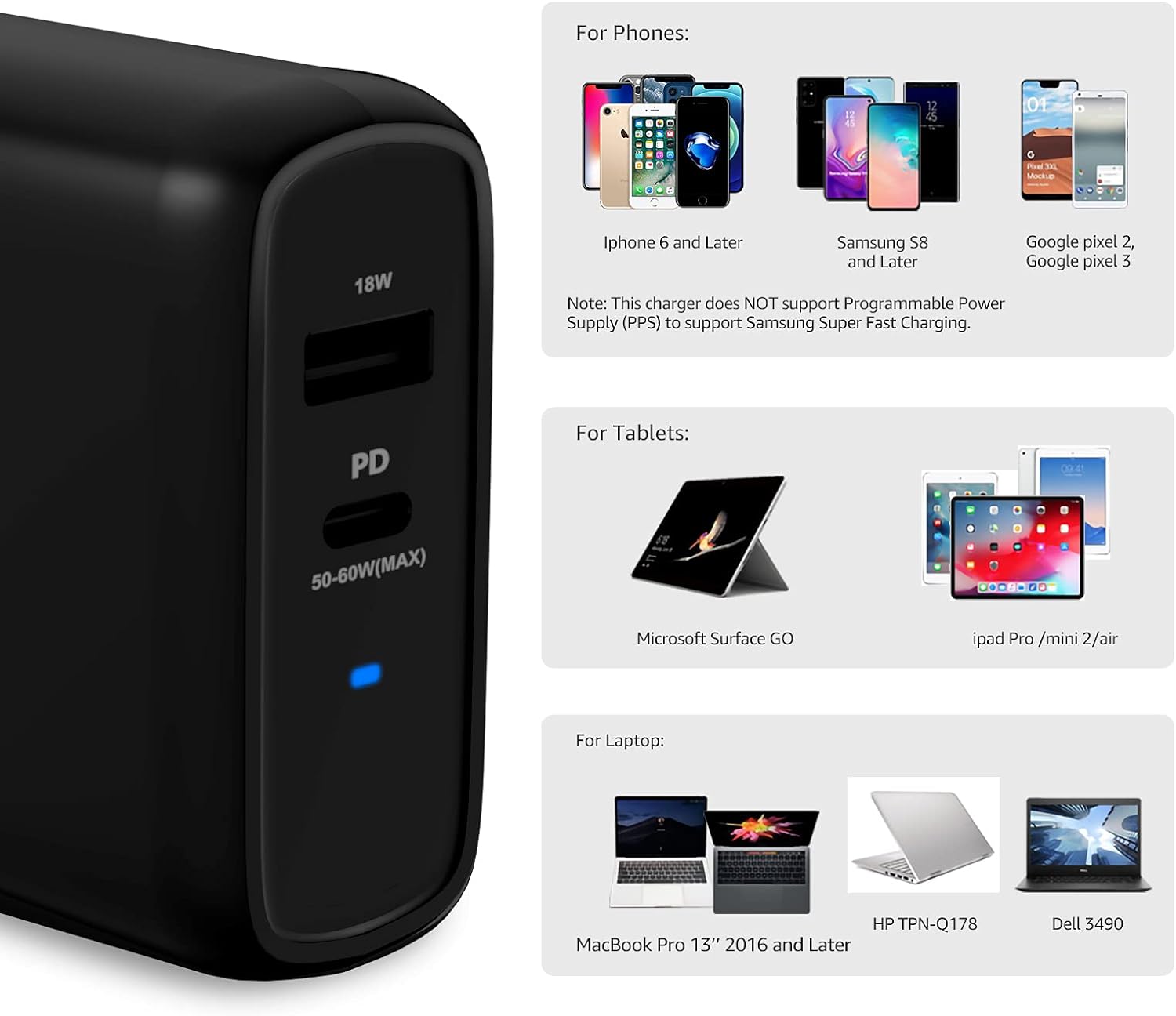 - Output one port: PD 3.0 (USB-C Port): 5V ⎓ 3A / 9V ⎓ 3A / 15V ⎓ 3A /20V ⎓ 3A (Up to 60W); Output dual ports: PD 3.0 (USB-C Port): 5V ⎓ 3A / 9V ⎓ 3A / 15V ⎓ 3A / 20V ⎓ 2.5A (Up to 50W), QC 3.0 (USB-A Port): 3.6-6V ⎓ 3A / 6-9V ⎓ 2A / 9-12V ⎓ 1.5A (Up to 18W)