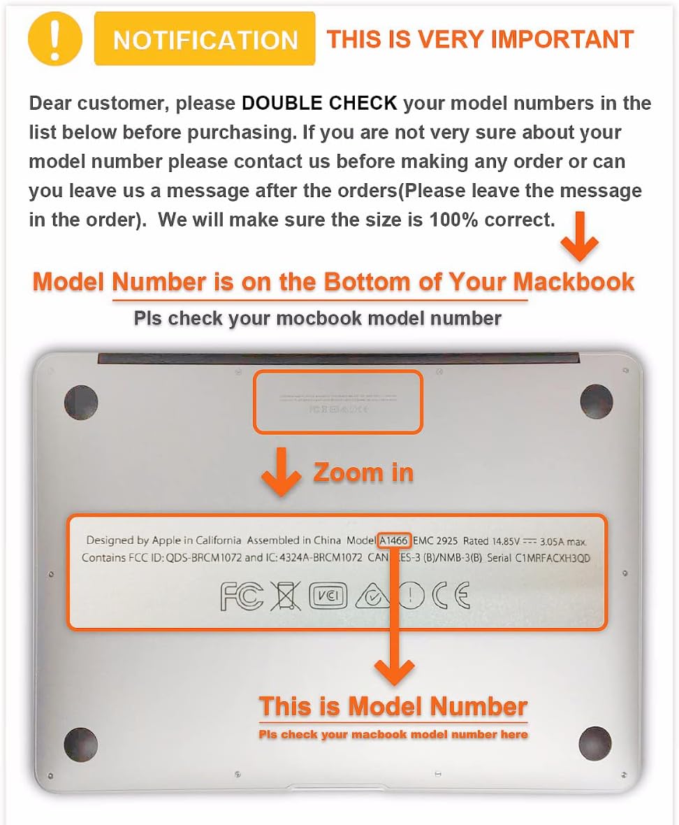- 【WARNING】This Hard Shell Case is NOT Compatible with MacBook Air 13 inch Case Released in 2022-2025 (New Version) and in 2010-2017 (Old Version), and It is NOT Compatible with MacBook Pro 13 inch Case. Please Check the Model Number “AXXXX” on the Back of your Laptop before Placing your Order.