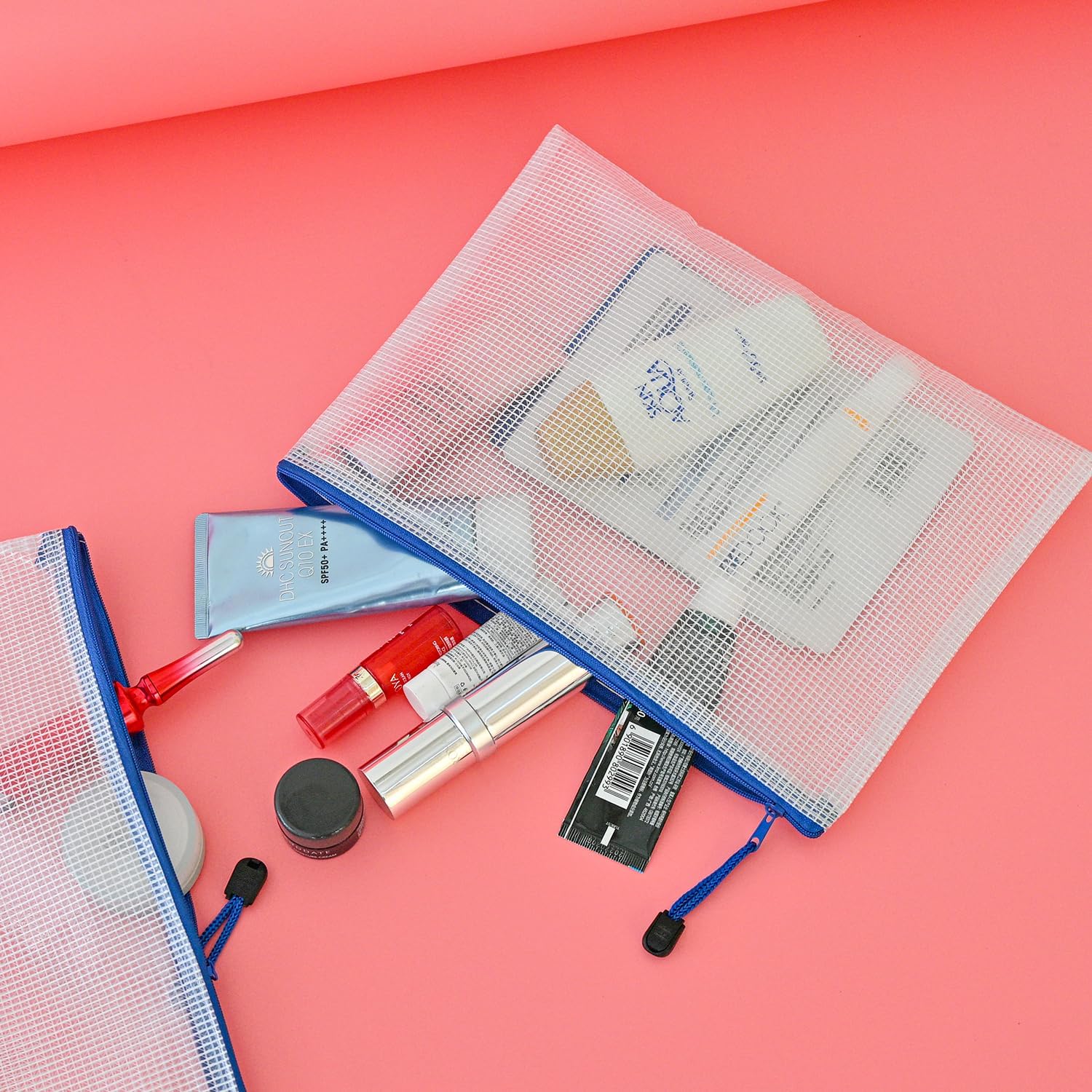 - Mesh pouches with translucent design. A solid PVC grid layout with moderate transparency could distinguish things in it easily, also protect your privacy at the same time