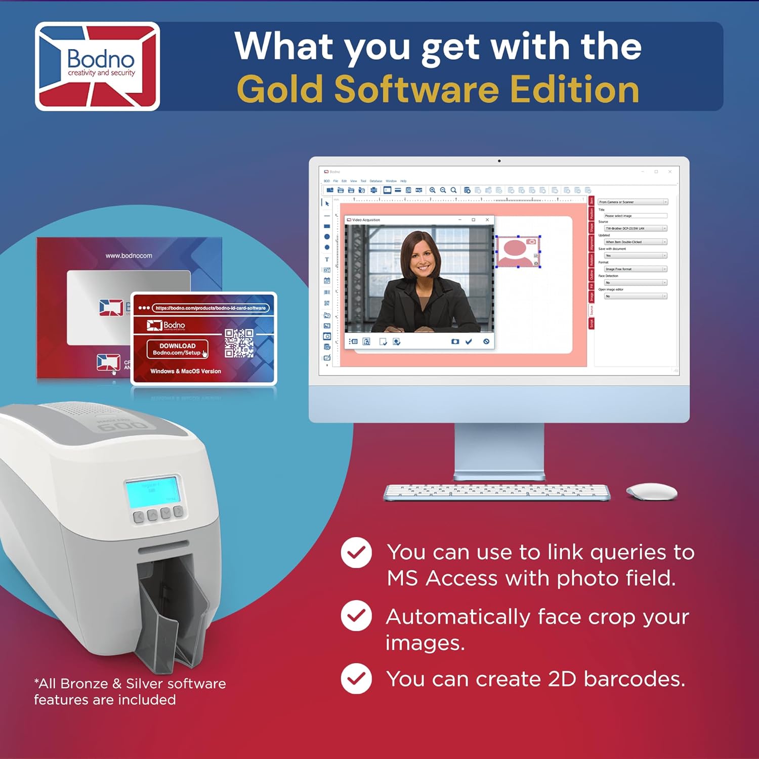 - BODNO GOLD EDITION WITH ONE-TIME LICENSE AND ACTIVATION CODE: Advanced features include 2D barcode printing, automatic face cropping, and seamless integration with MS Access and SQLite databases.