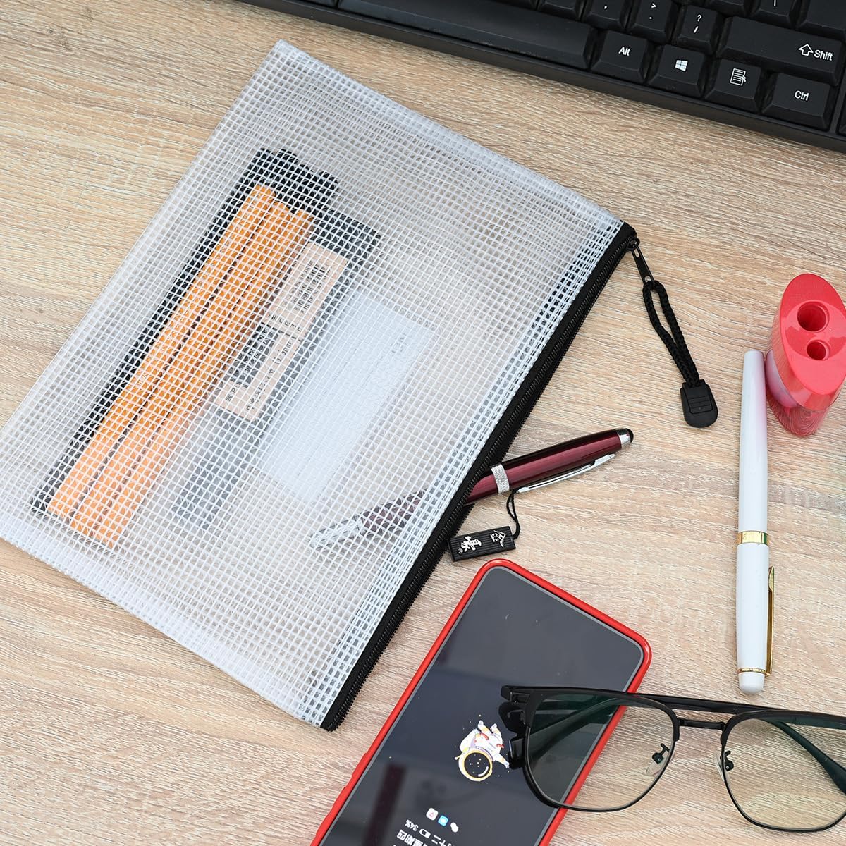 - Mesh pouches with translucent design. A solid PVC grid layout with moderate transparency could distinguish things in it easily, also protect your privacy at the same time
