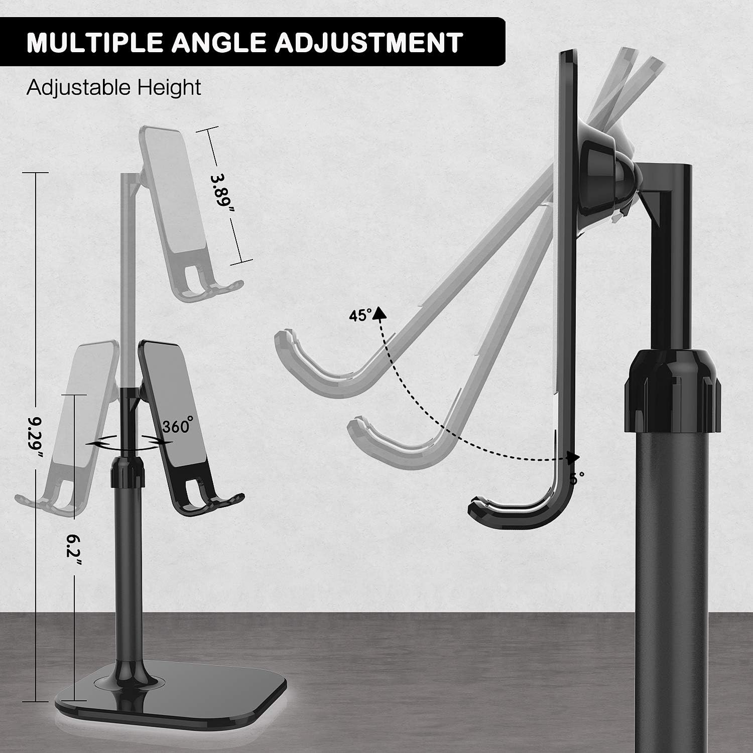 - ADJUSTABLE:This cell phone stand can be easily adjusted to the (0°~ 45°) angle by hand, and it stays firmly in place.The height can be easily adjusted