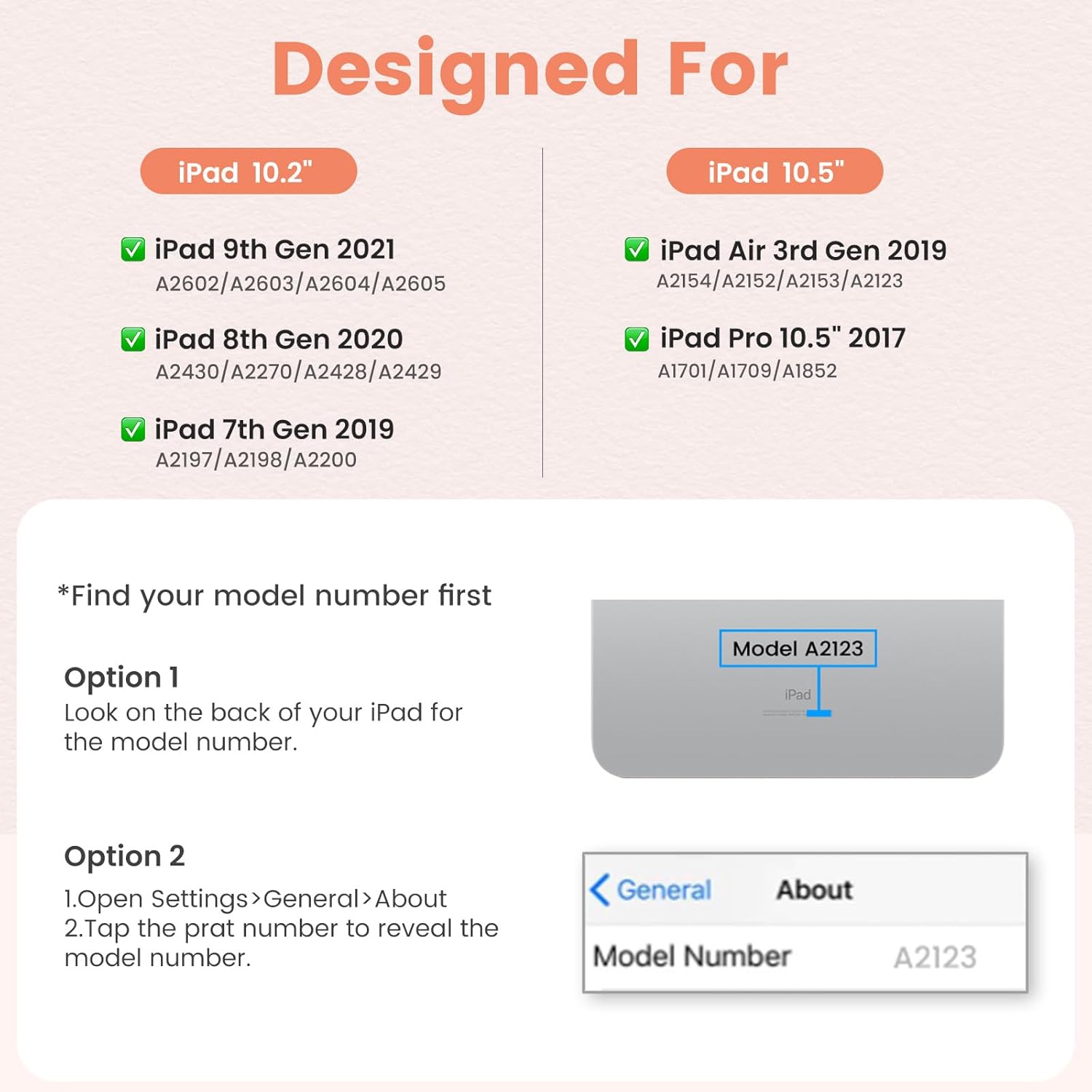 - â ăIPad 10.2/10.5 inch Keyboard Case CompatibilityăââNo pen or charge included!ââThe iPad keyboard case is designed for new iPad 9th 2021 (Model number: A2602/A2603/ A2604/ A2605),8th 2020 released (A2430/A2270/ A2428/ A2429), iPad 7th Generation 10.2 inch 2019 released (A2197/A2198/A2200), iPad Air 3 10.5" 2019 released (A2152/A2123/A2153/A2154) and iPad Pro 10.5 inch 2017 released (A1701/A1709/A1852). Please check the back bottom of your iPad to find the model number.