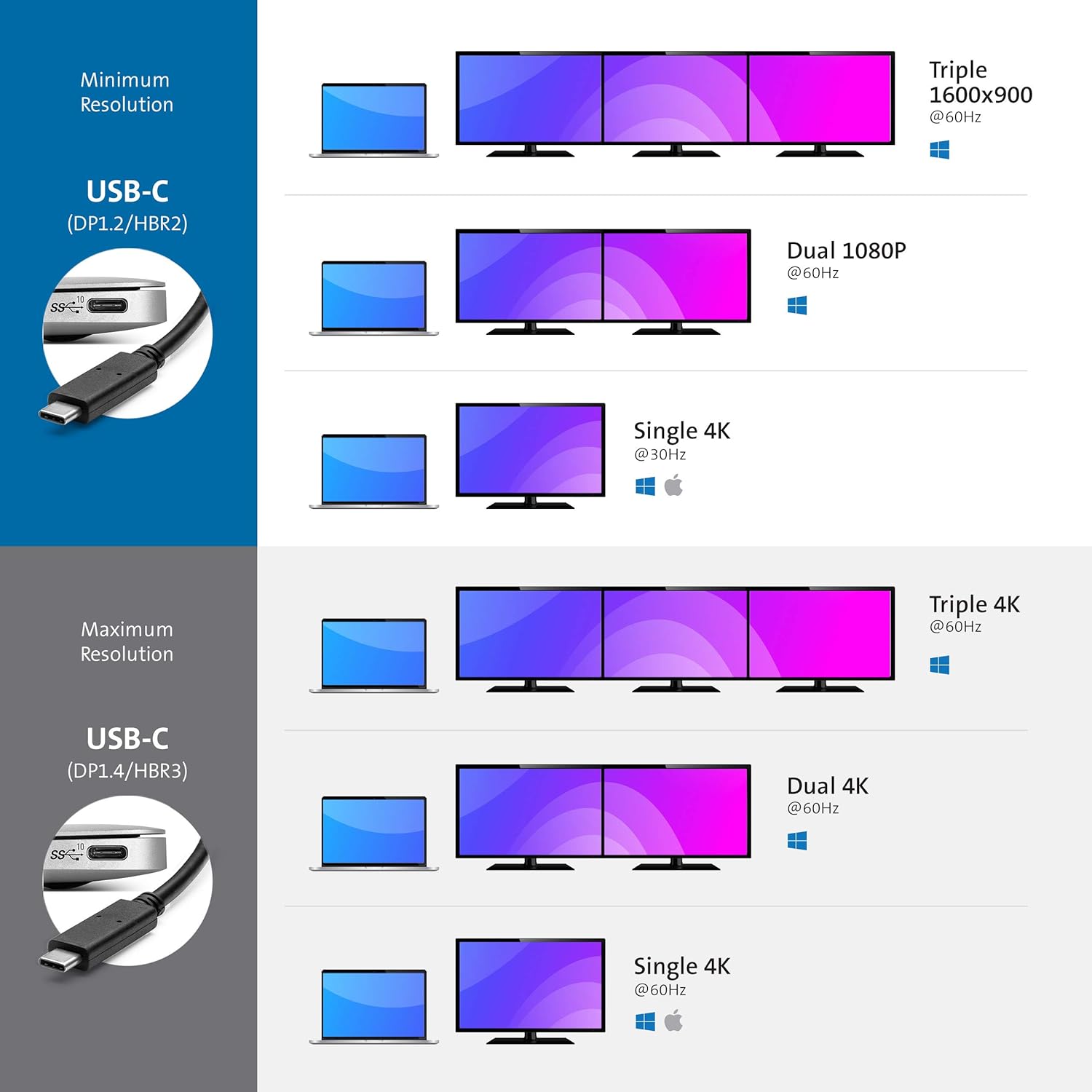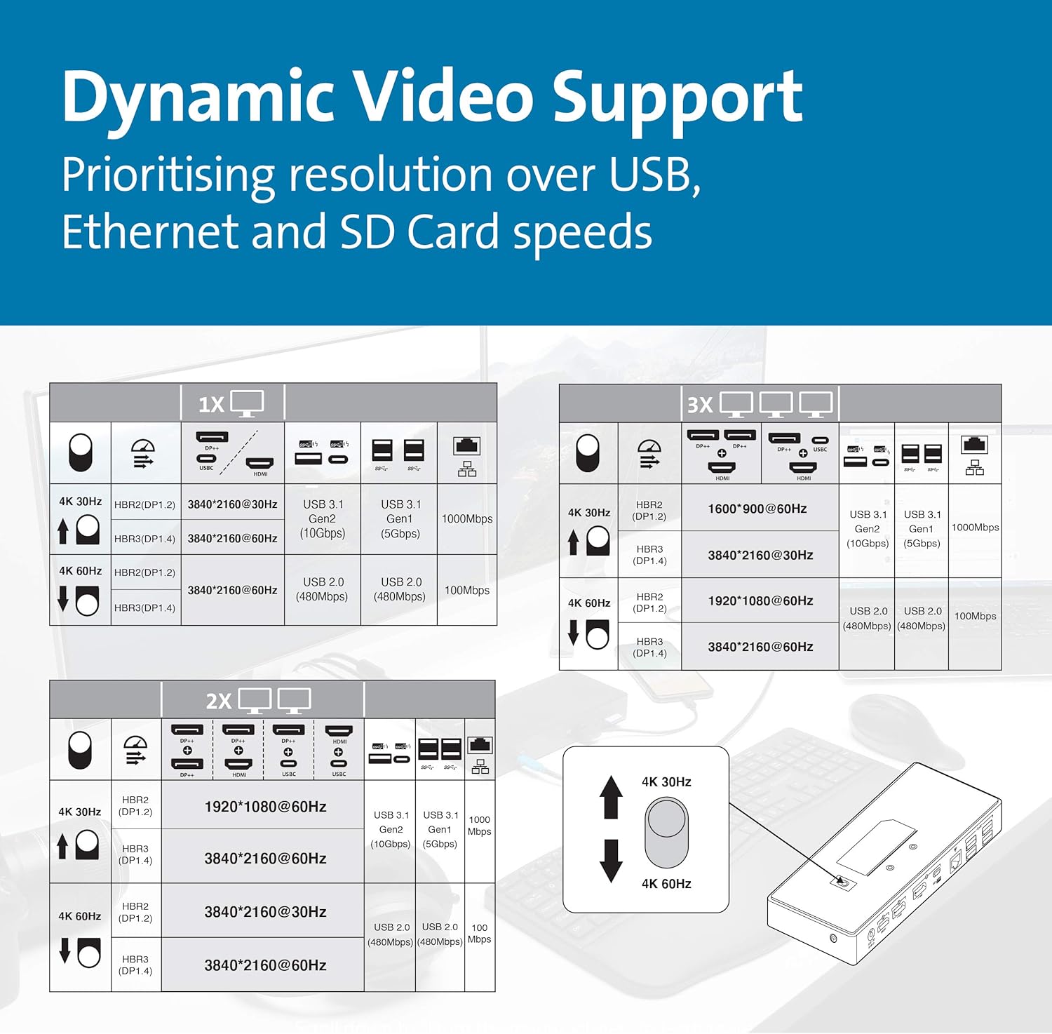 - Dual monitor 4k dock provides up to Dual or Single 4k@60Hz; Four video-out ports for flexibility: 2 DisplayPort ++, 1 HDMI 2.0, and 1 USB-C Alt Mode port which can be used in place of one DP++ port; supports HBR2 (DP1.2) and HBR3 (DP1.3/1.4); laptops with HBR3 will always get dual 4k@60Hz, and HBR2 laptops can choose to prioritize port speed or display resolution with the 4K 30Hz/60Hz switch on the bottom of the dock