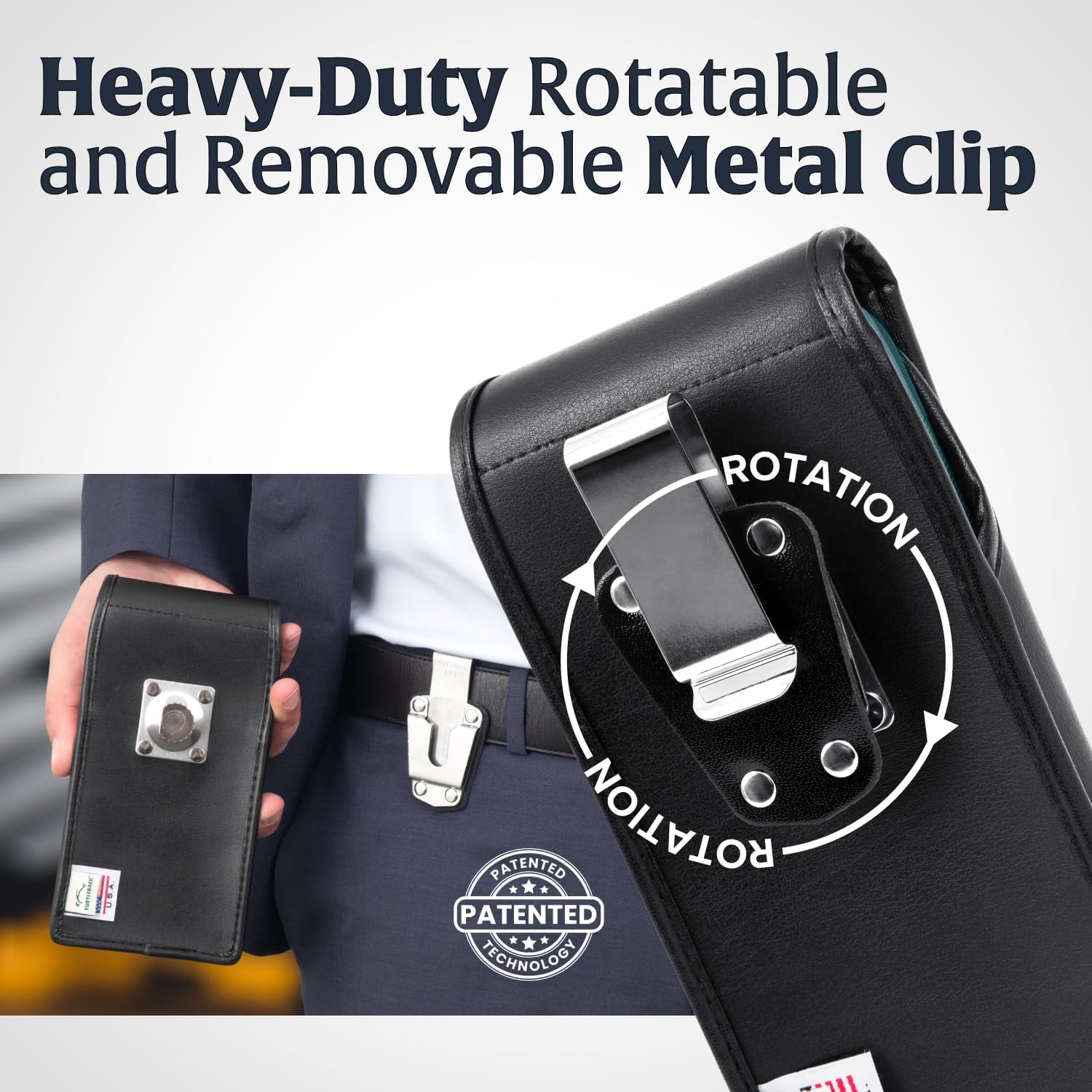 - PATENTED HEAVY-DUTY BELT CLIP: This phone belt holder features a specially designed patented rotating rtcheting clip for a secure carry. The removable, rotatable clip locks with a D-ring mechanism, gripping tightly to your belt and keeping your phone holster secure while on the move. A durable choice in cell phone cases & covers, this stylish iPhone belt holder for men is a secure carry solution for everyday use.