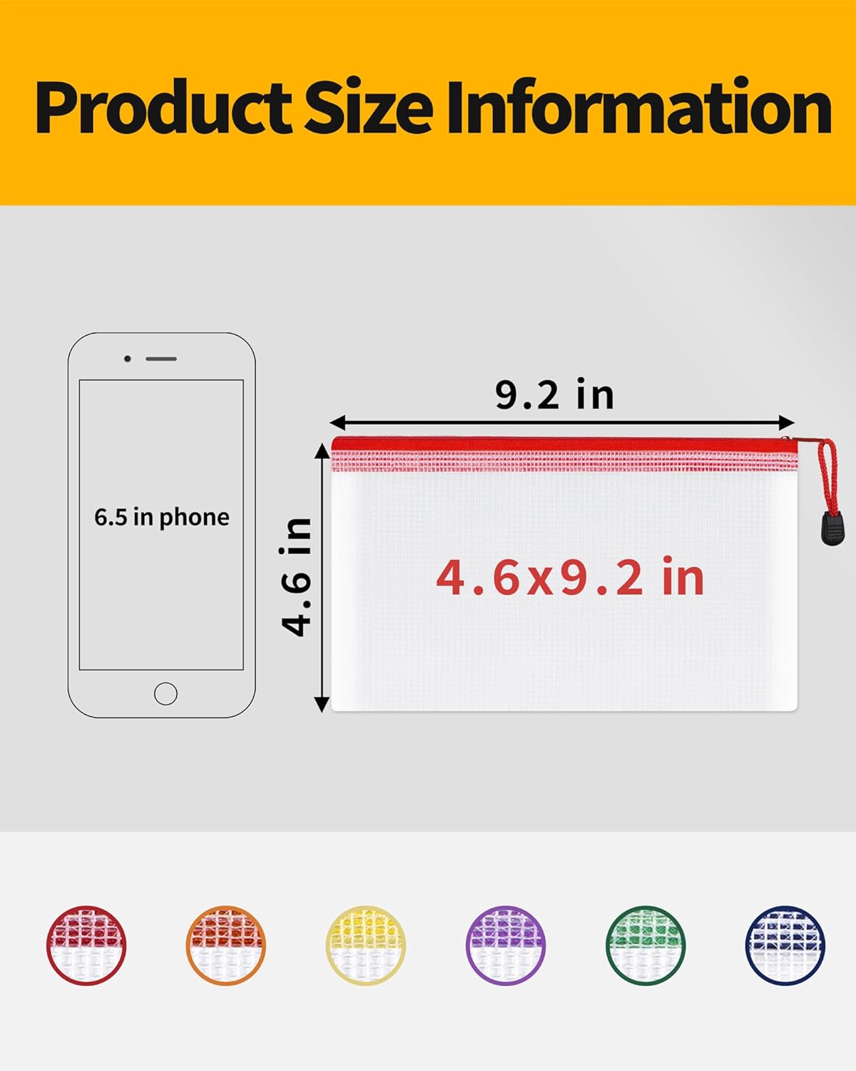 SUNEE Plastic Mesh Zipper Pouch 4.6x9.2 in (6 Colors, 12 Packs), Small Water-Resistant Zip Bag for School Office Supplies, Pencil Organizing Storage