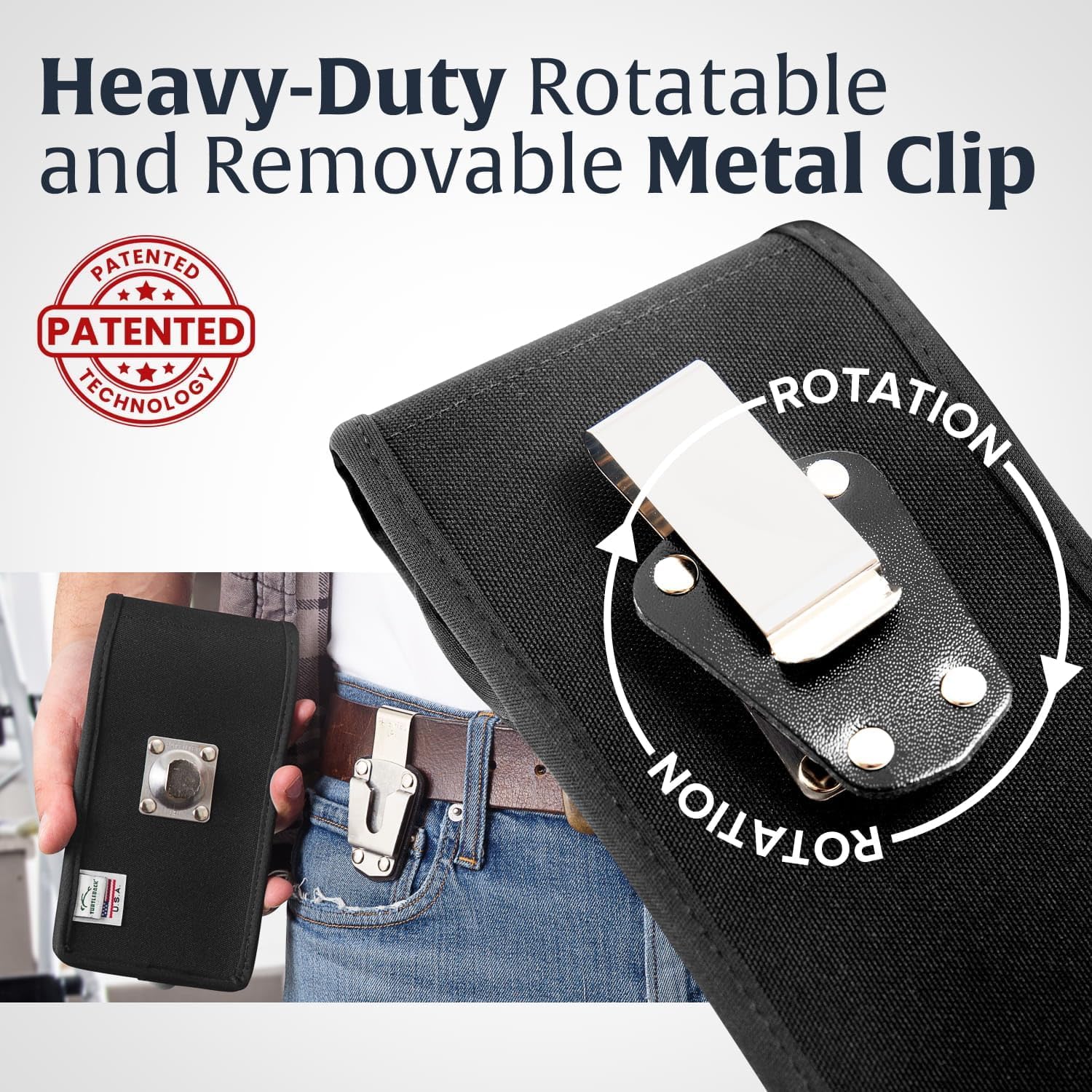 - PATENTED HEAVY-DUTY BELT CLIP: This phone belt holder features a specially designed patented rotating rtcheting clip for a secure carry. The removable, rotatable clip locks with a D-ring mechanism, gripping tightly to your belt and keeping your phone holster secure while on the move. A durable choice in cell phone cases & covers, this stylish iPhone belt holder for men is a secure carry solution for everyday use.