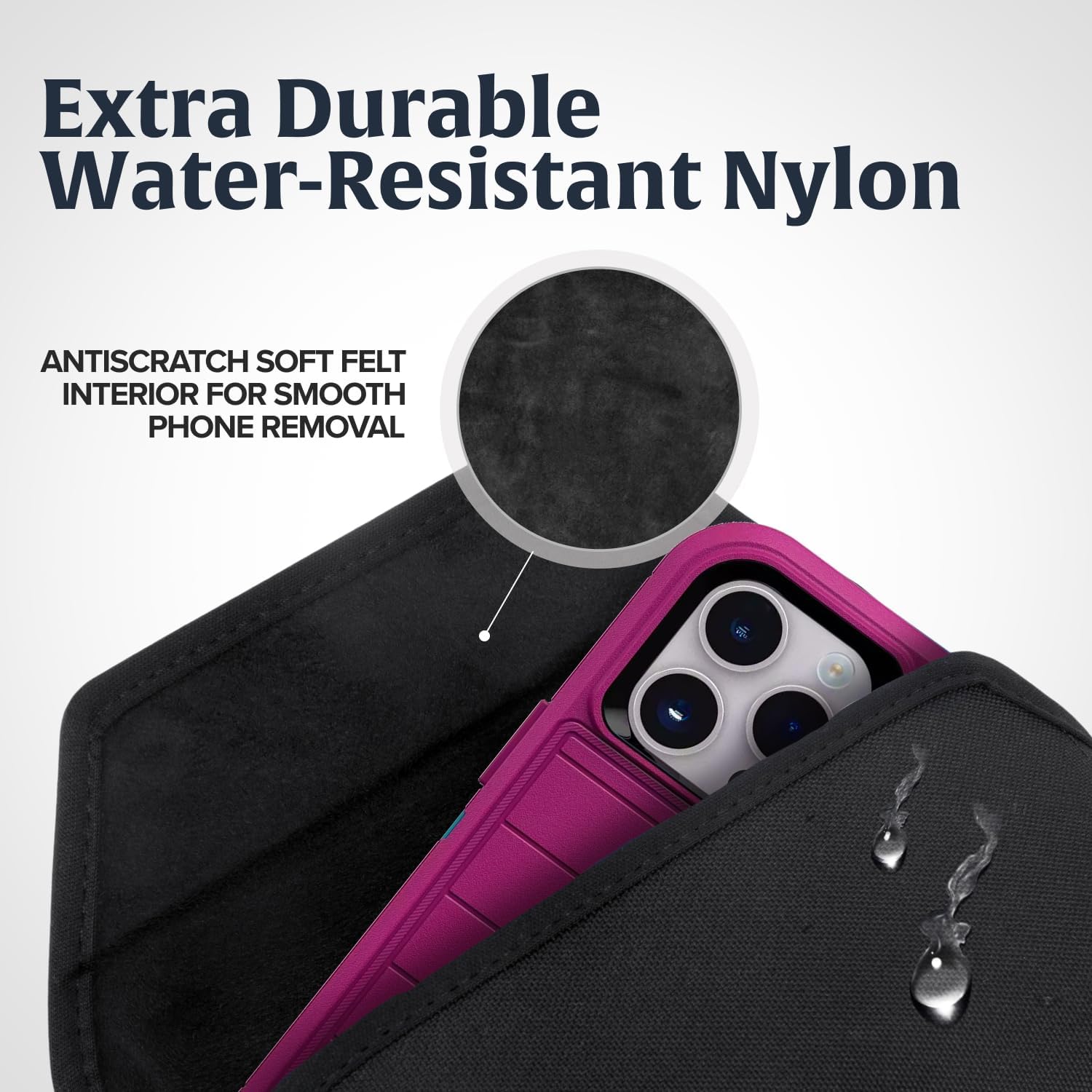 - SPECIALLY DESIGNED FOR IPHONES: This premium phone belt holder fits iPhone 16 Pro, 16e, 15 pro 14 Pro 13 Pro, and 12/12 Pro. It accommodates iPhones with a Defender Bulky Style or Size Case. With interior dimensions of 6.28 x 3.28 x 0.64 inches, this stylish iPhone belt holder is a durable cell phone pouch and reliable men's belt clip.