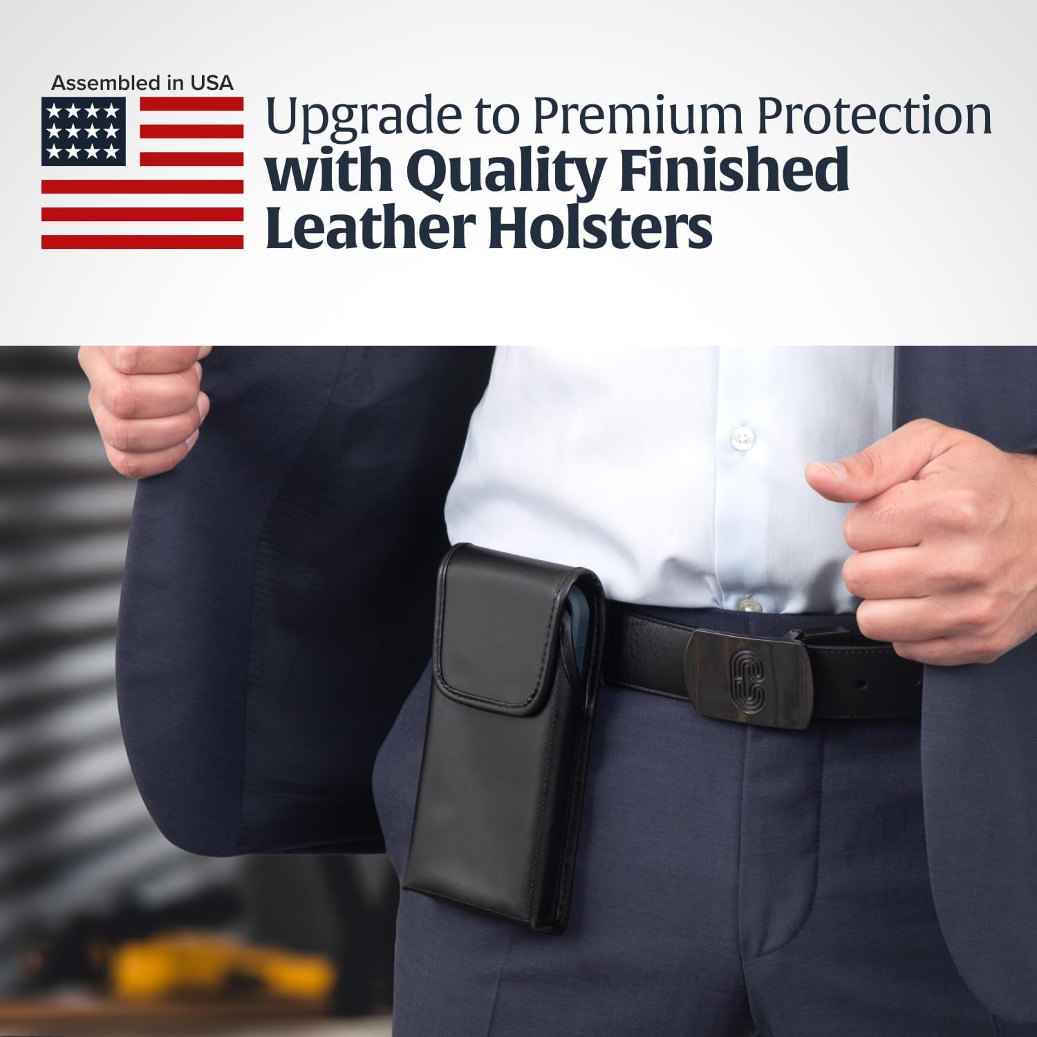 - DESIGNED AND BUILT IN THE USA: The Turtleback leather phone case is crafted from premium imported leather, offering a sleek look and durable feel that complements any style. This phone holster fits vertical on your belt and features a secure, rotating ratcheting belt clip for reliable everyday carry. Whether you need a rugged iPhone belt holder for men or a stylish holster for work, we have you covered. Turtleback has been proudly designing and building cases in the USA since 2001.