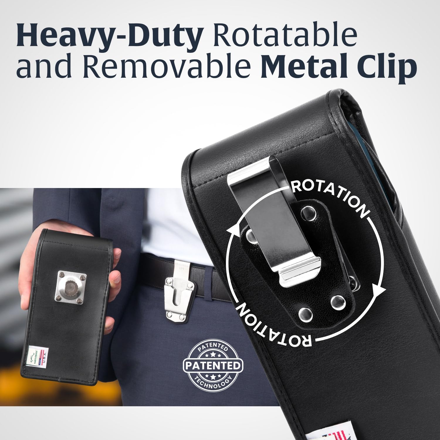 - PATENTED HEAVY-DUTY BELT CLIP: This phone belt holder features a specially designed patented rotating rtcheting clip for a secure carry. The removable, rotatable clip locks with a D-ring mechanism, gripping tightly to your belt and keeping your phone holster secure while on the move. A durable choice in cell phone cases & covers, this stylish iPhone belt holder for men is a secure carry solution for everyday use.