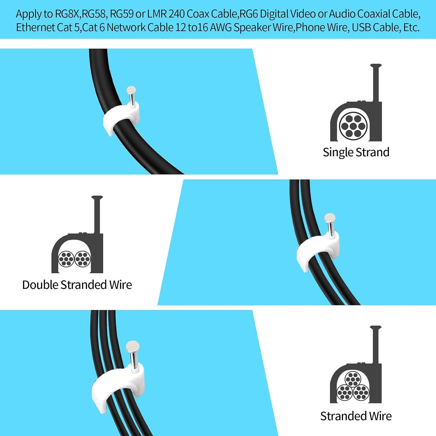 - [ Durable ] Cable clips are made of premium stabilized plastic, white style is more versatile, and integrates with the home environment to make it cleaner. Round cable clips allow you to secure runs of round cables like coax to walls and floorboards for a cleaner look and prevent tripping over loose cables