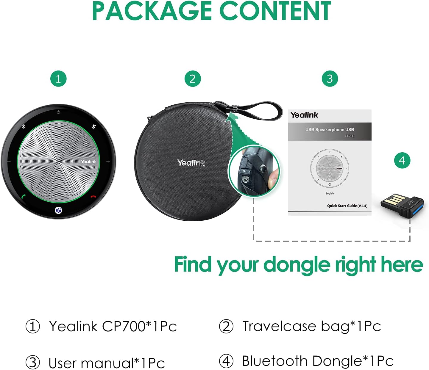 - CONTACT US WHEN ANY QUESTION---YEALINK Warranty: 30 days money back, 60 days free return, life time warranty. This Package including 1 Pc CP700 speakerphone, 1 Pc collecting zipper bag,1 Pce user manual.1 USB Dongle【Dongle at the zip case button.】