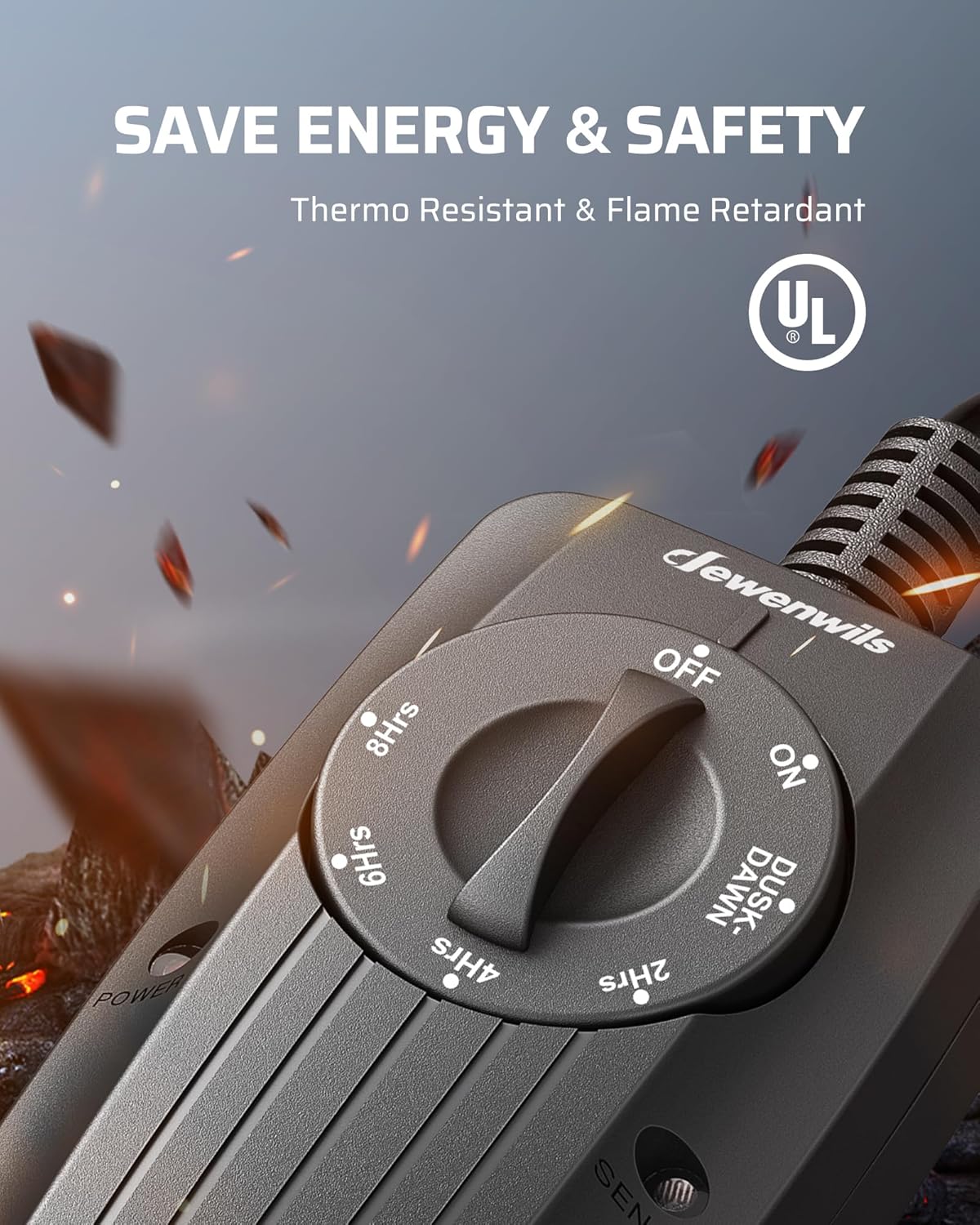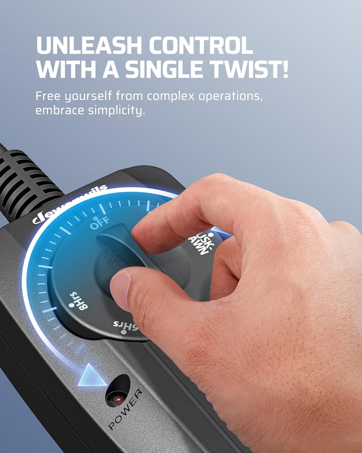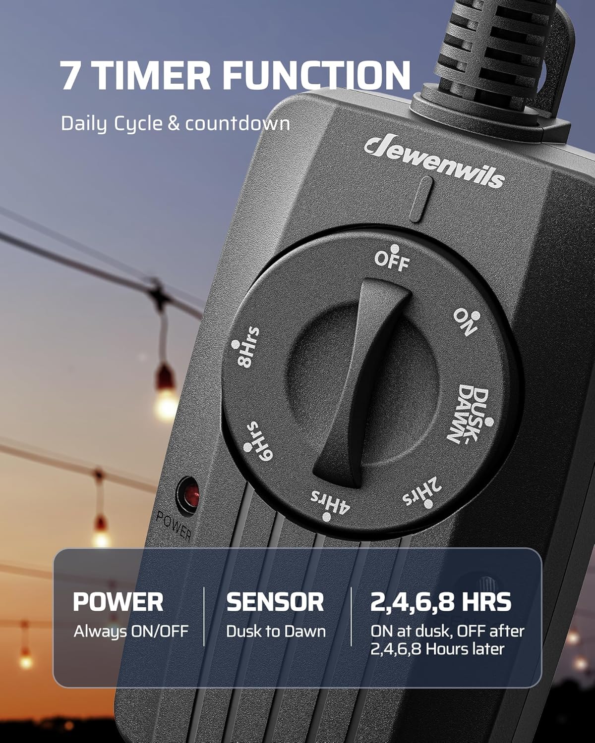 - MULTI TIMER CHOICES - Built-in light sensor mechanical timer, automatic or manually set lighting schedules with environment brightness; can turn on or off according daylight, or remain ON/OFF continuously; ON at dusk, OFF at dawn, ON at dusk OFF after 2/4/6/ 8 hours, daily repeat