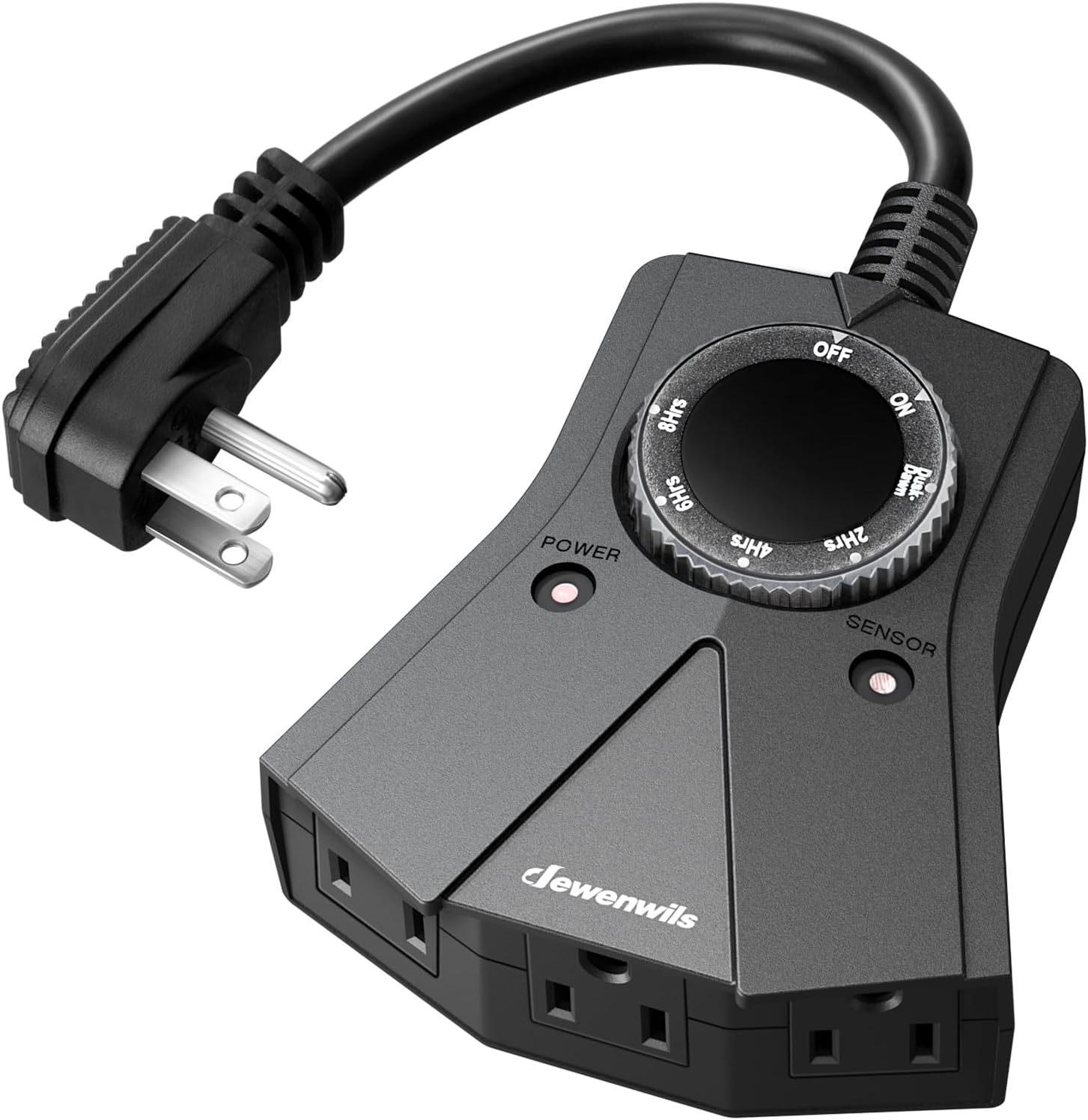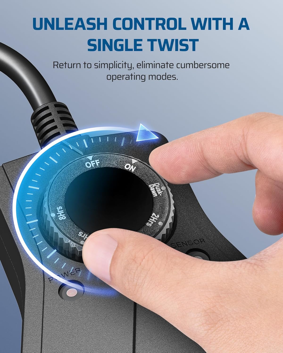 - MULTI TIMER CHOICES - Built-in light sensor mechanical timer, automatic or manually set lighting schedules with environment brightness; can turn on or off according daylight, or remain ON/OFF continuously; ON at dusk, OFF at dawn, ON at dusk OFF after 2/4/6/ 8 hours, daily repeat