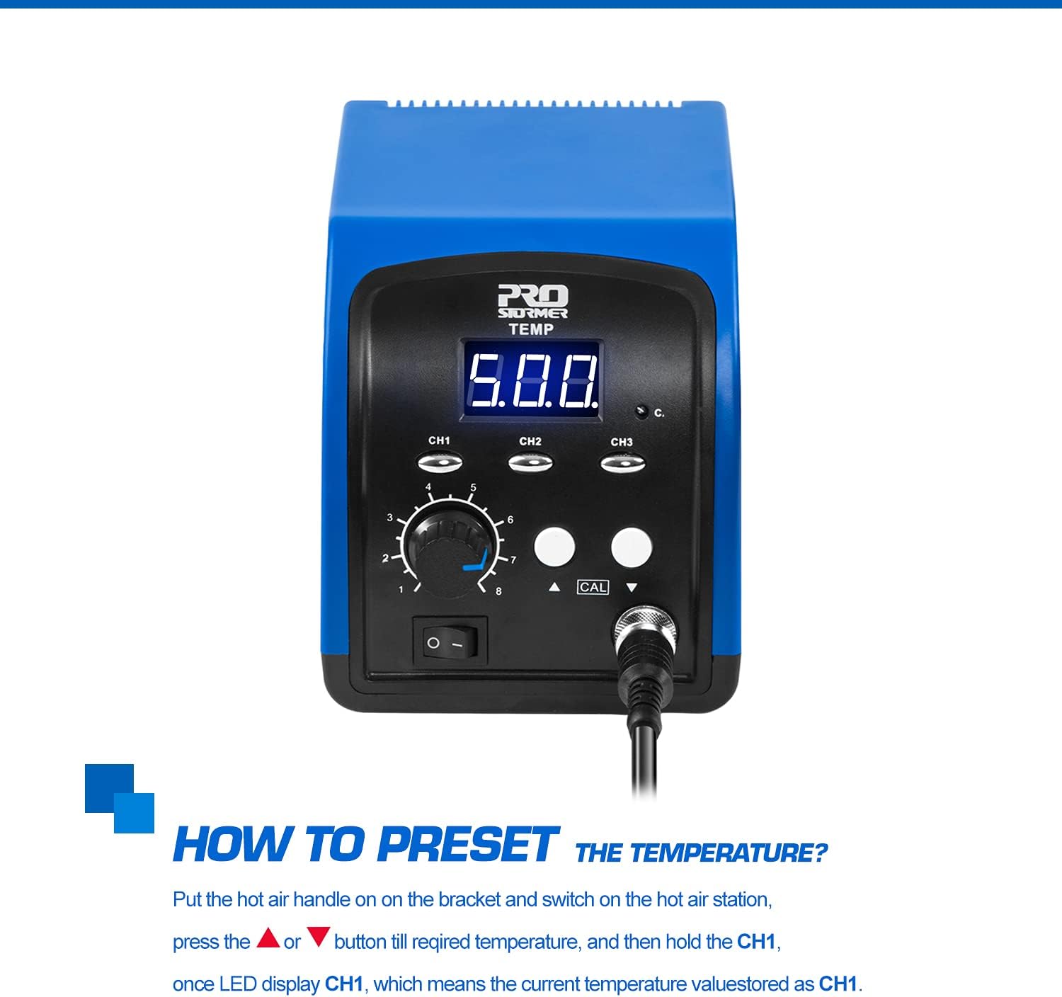 - 3 Sets Stored Temperature: Prostormer Hot Air Rework Station comes with 3 sets of temperature storage funciton. You can set 3 groups of temperature in CH1, CH2 or CH3 to facilitate direct use next time