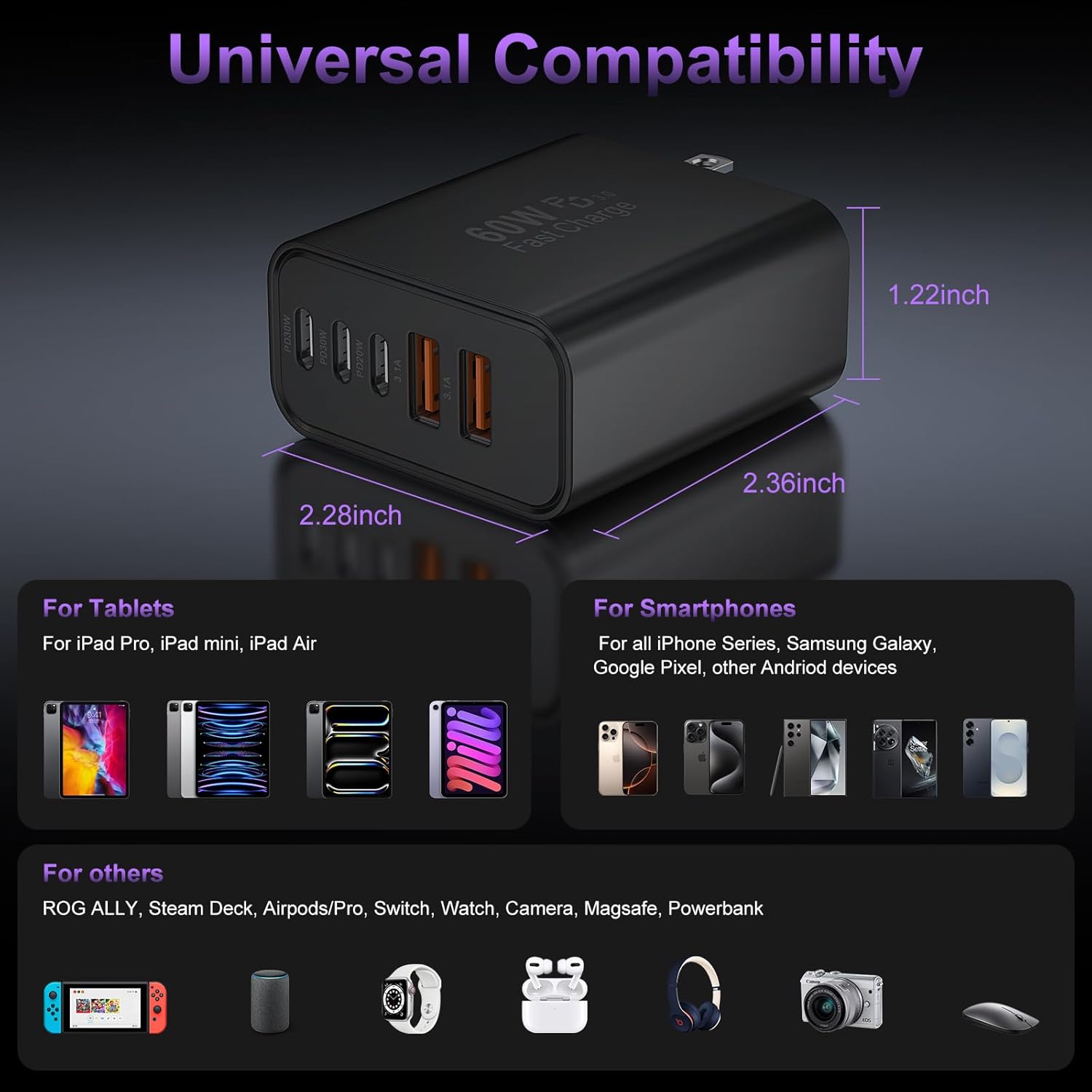 - Compact and Portable Phone Charger Brick: Designed with the pocket-friendly compact body and 5-port charging cube, the USB C box is integrated to charge multiple devices at home, office and travel. Small size saves you space and fits perfectly into pockets, handbags, travel cases. Packaged with dual 60W 5-port usb c wall chargers (cable not included). If you have any problems with the c type charger block, please contact us