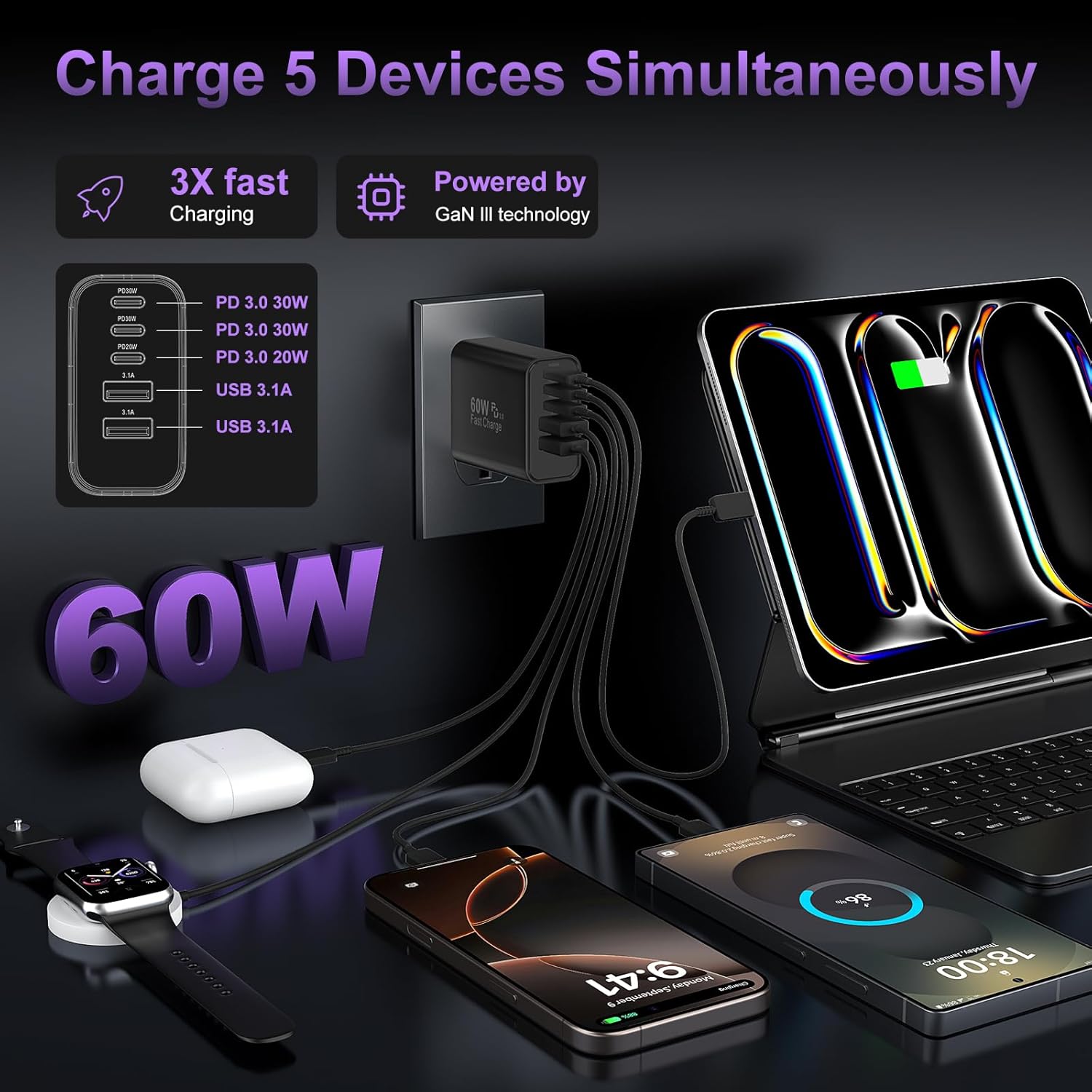 USB C Fast Wall Charger Block, 2Pack 60W USBC Charging Cubes, 5-Port PD+QC Power Adapter Multiport Brick Type C Box Plug for Phone 16/15/14/13/12/11/Pro Max/Plus, Pad Mini/Pro/S25/S24-Black