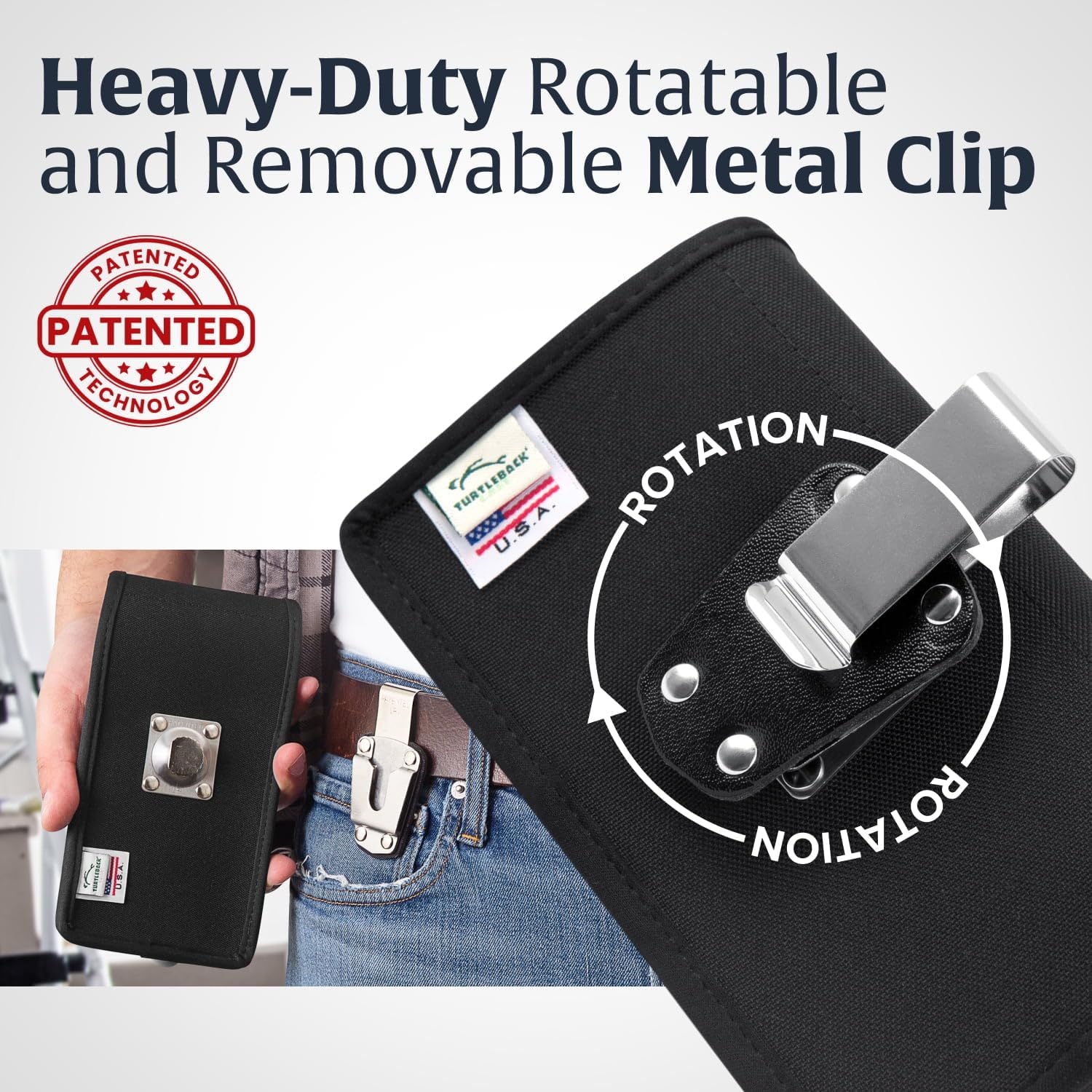 - DESIGNED AND BUILT IN THE USA: The Turtleback premium phone holster is crafted from high-quality reinforced nylon, laminated with a proprietary durable backing material to provide superior resistance against dirt and water. Built for strength and style, this iPhone belt holder for men combines long-lasting durability with aesthetic appeal and an improved tactile feel. This phone holster fits horizontally on your belt and features a secure, rotating ratcheting belt clip for reliable everyday carry. Whether you prefer a rugged nylon holster or a sleek leather phone case, Turtleback delivers reliability and craftsmanship you can trust. Proudly Designed and Built in the USA since 2001.