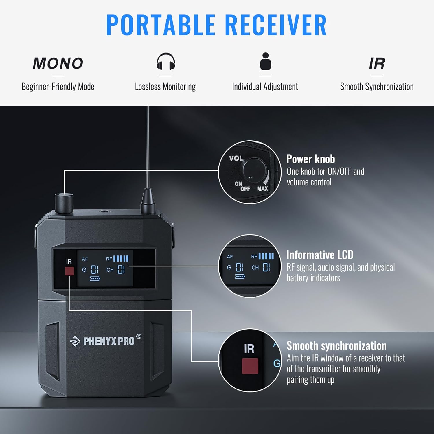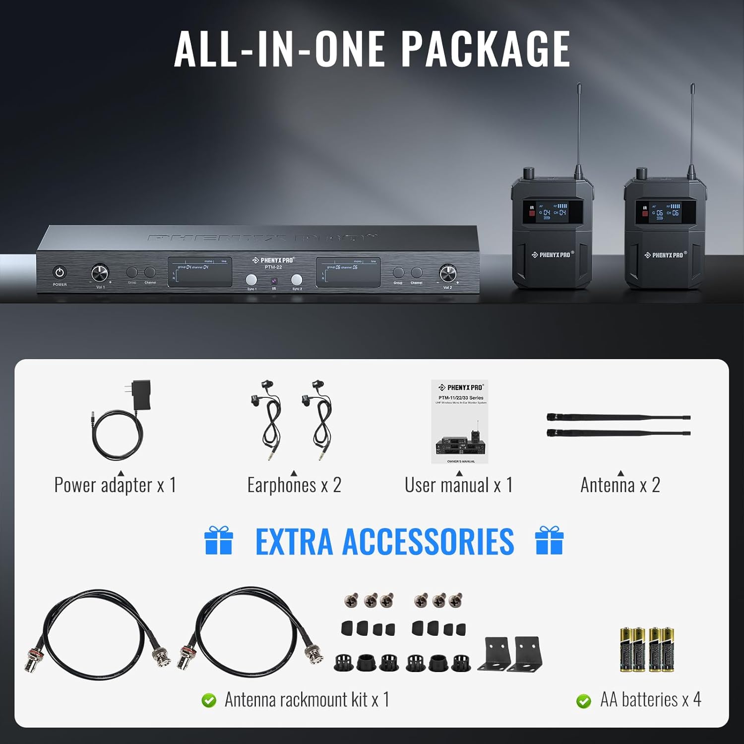 Phenyx Pro UHF Mono Dual Wireless in-Ear Monitor System, Metal Wireless IEM System, Sturdy Bodypack Receiver, 2x50 Frequencies, Separate Outputs,164ft Operation, Suitable for Band and Studio (PTM-22)