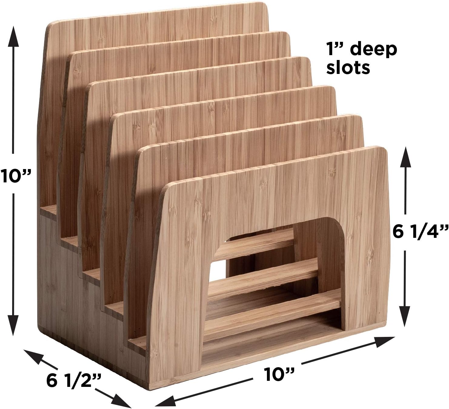 - [Bamboo Step Design] Crafted from beautiful and durable bamboo, this inclined organizer features a unique step sorter design with five individual 1-inch wide upright slots, allowing you to neatly arrange and easily view your smartphones, tablets, and slim laptops in a space-saving, tiered format.