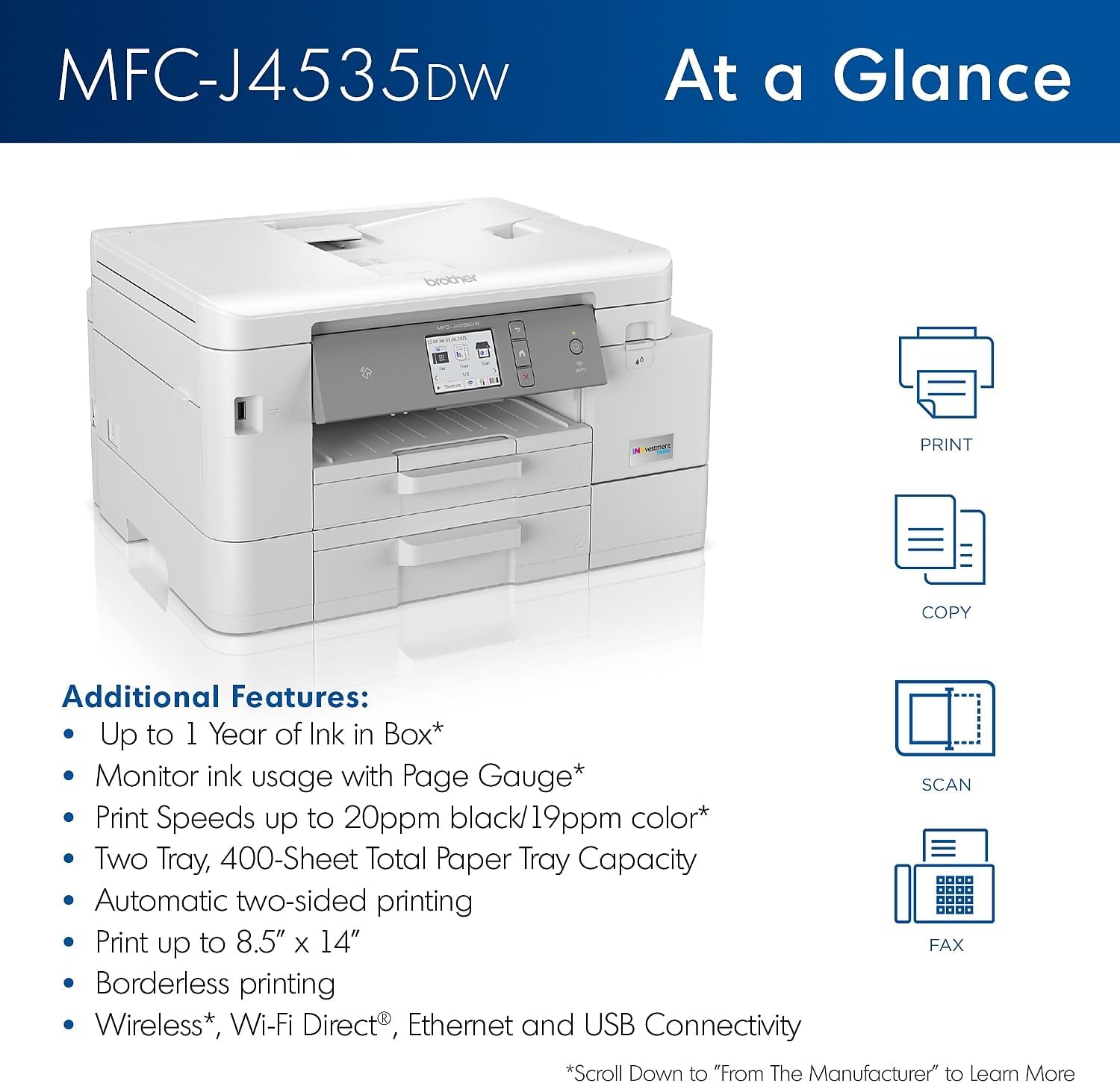 Brother MFC-J4535DW INKvestment -Tank All-in-One Color Inkjet Printer with NFC, Duplex and Wireless Printing Plus Up to 1-Year of Ink in-Box, White