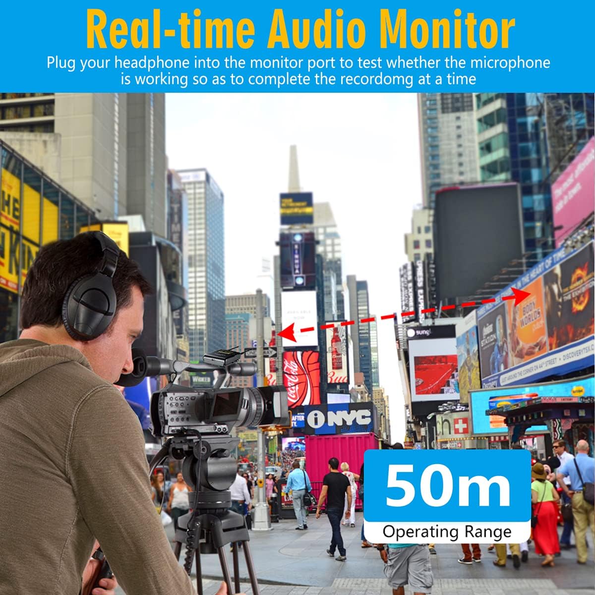 - [ Real-time Audio Monitoring ] - Connect your favorite headphones to the receiver's 3.5mm headphone jack, you can listen the sound while recording, and monitor the audio status to complete the recording at one time. Daylight-readable displays on the transmitters show volume, battery status and channels. Display on the receiver show connection quality of every transmitter and battery status.