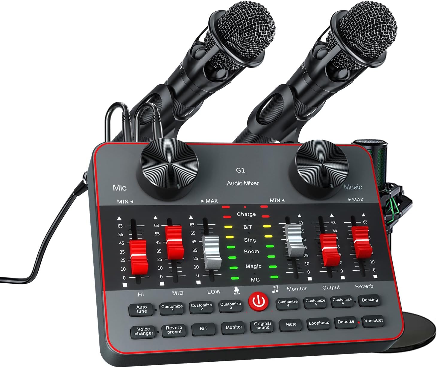 - 【 Made for Tik Tok Content Creator Live Sstreaming】A simple set of podcast starter kit equipment to live streaming equipment only needs a microphone live sound card, with monitoring earphone, stand, and pop filter.The Audio Interface mixer supports 2 people using to broadcast at the same time.Use a suite of vocal effects, treble/bass, reverb, 4 voice changers, 12 steps electronic music tunes, 5 sound scenes modes to get great mixing for your streaming