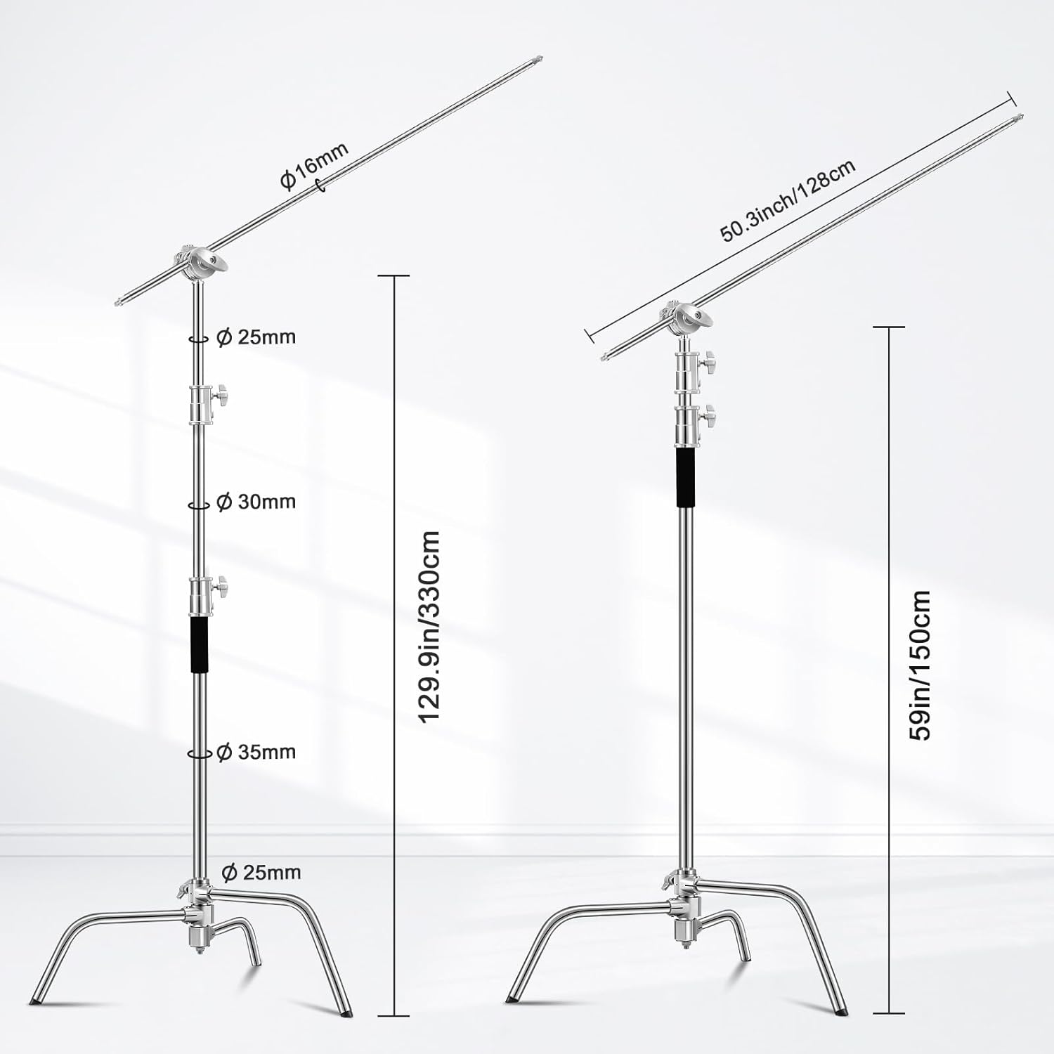 - 【Adjustable Stable C-Stand】Height of center stand column can be adjusted from 4.92ft/150cm to 10.8ft/330cm, Holding arm length:4.2ft/128cm. The center stand has built-in buffer spring, which can reduce the impact of sudden fall of the installed equipment and protect the equipment when adjusting the height