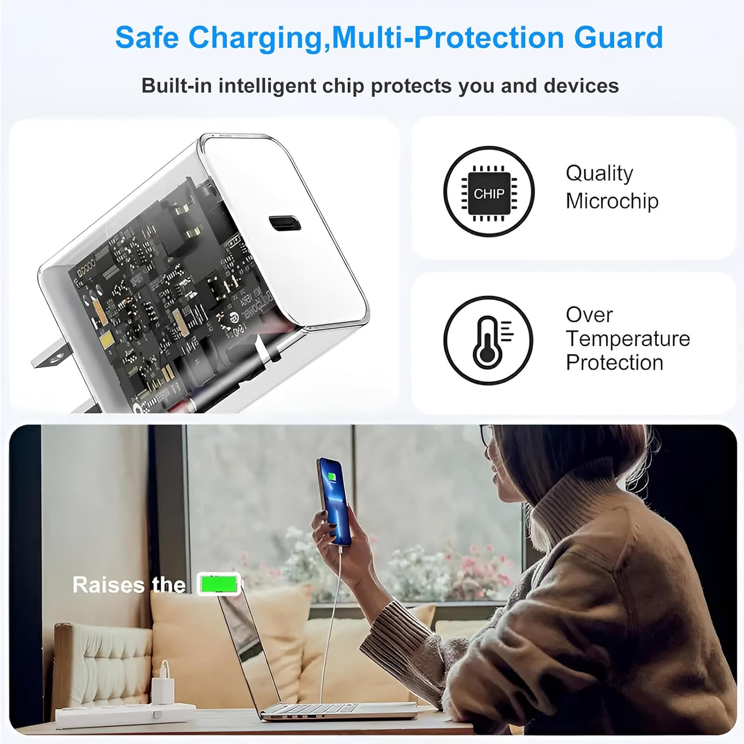 - Safety Guard: Conforms to UL/ ETL safety standard, with intelligent chip inside, the iPhone charger automatically matches the current as your device's need. PD USB C charger block provides multi protections against over-current, over-voltage, over-heating,over-charge,over-temperature and short-circuit, keep your device safe while charging.