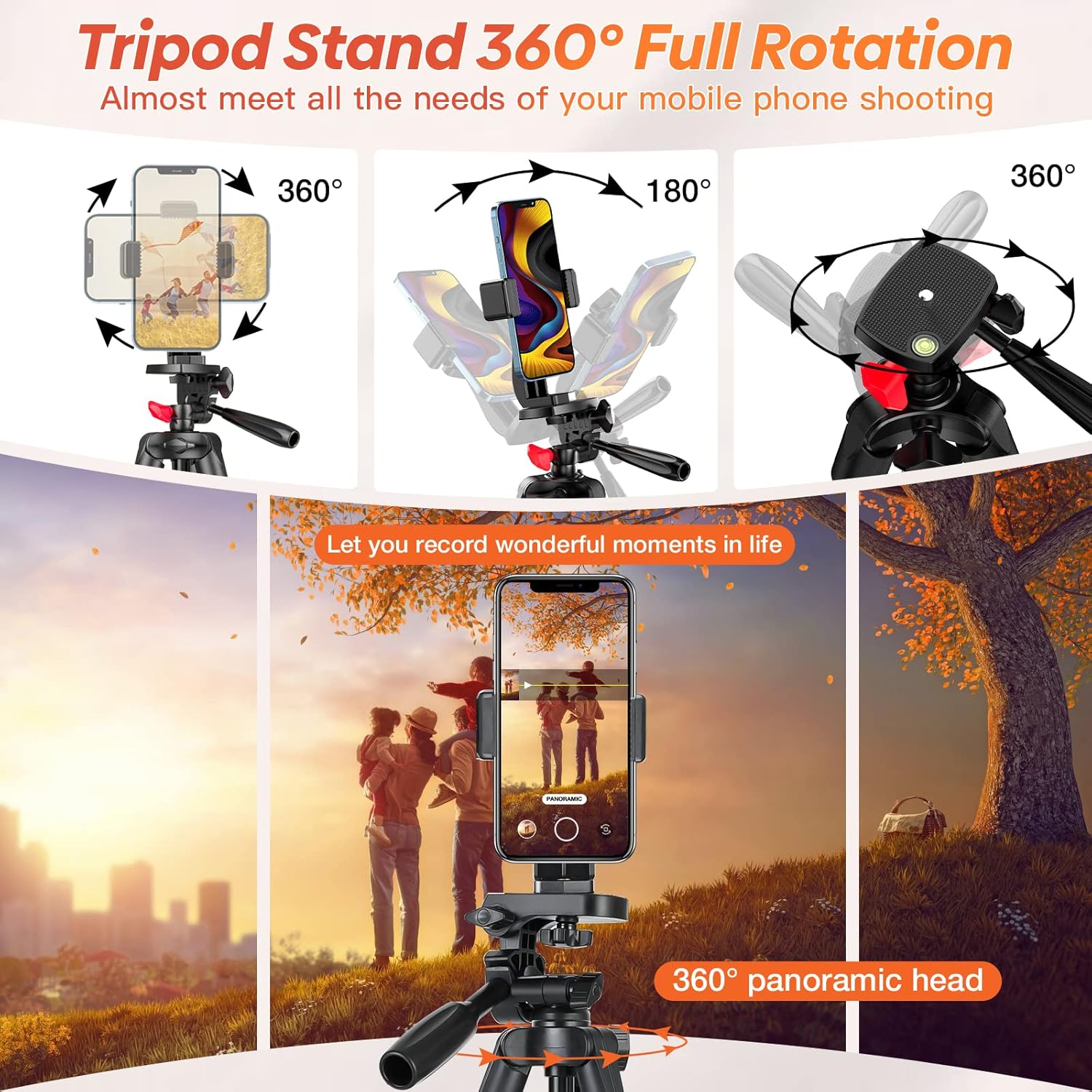 - 【360° Rotating Head】The 3-way pan head with a 360° rotating handle and phone holder allows you to capture photos and videos from any angle, including panoramic shots. The anti-skid and anti-scratch rubber feet provide stability and protect your phone from drops and damage.